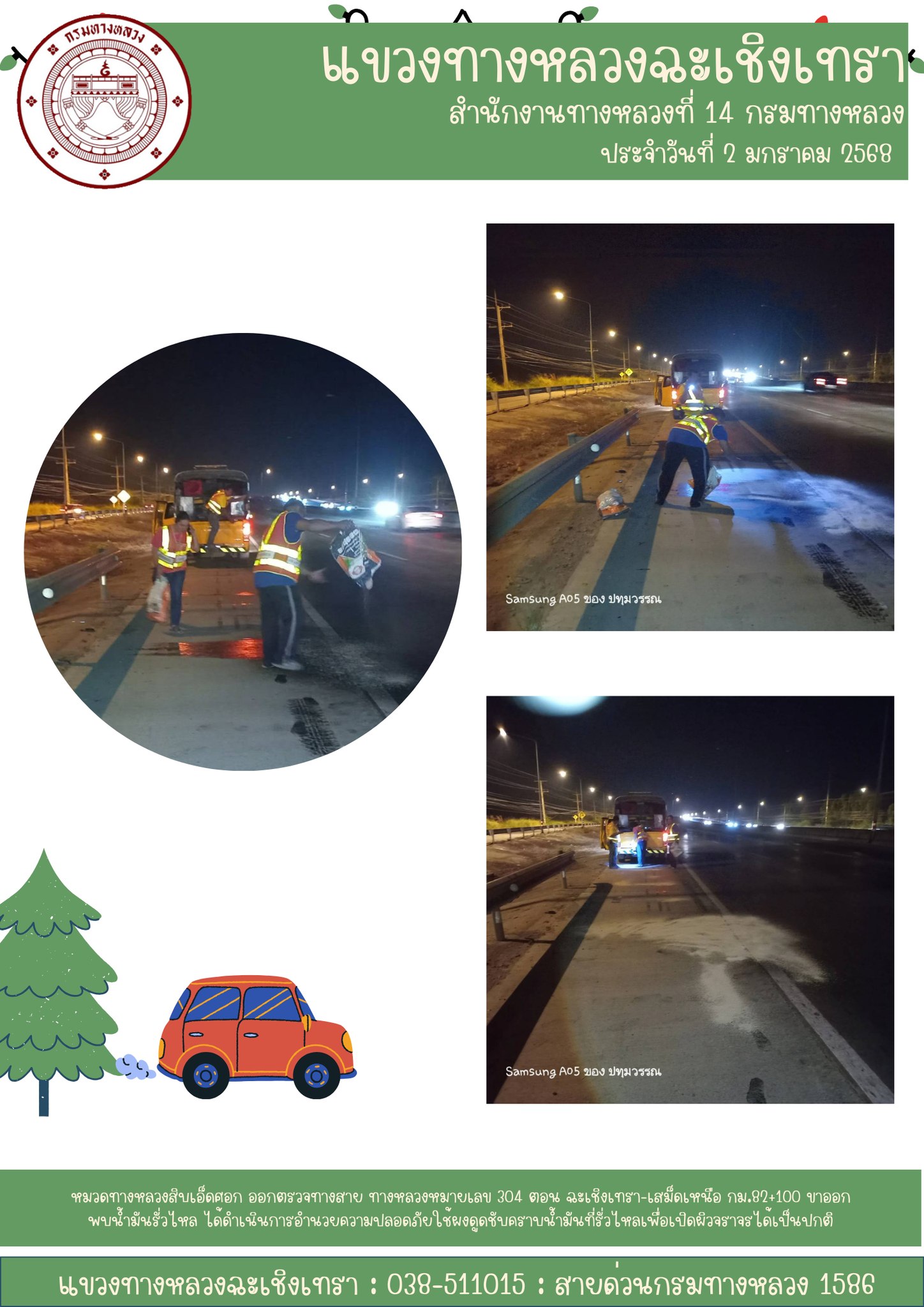 ดำเนินการอำนวยความปลอดภัยใช้ผงดูดชับคราบน้ำมันที่รั่วไหลเพื่อเปิดผิวจราจรได้เป็นปกติ |