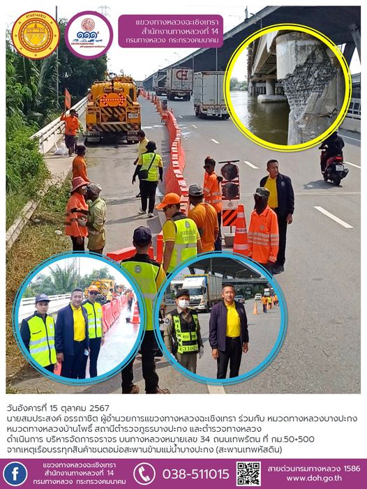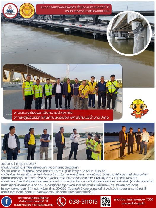 ตรวจสอบประเมินความปลอดภัย จากเหตุเรือบรรทุกสินค้าชนตอม่อสะพานข้ามแม่น้ำบางปะกง (สะพานเทพหัสดิน) |