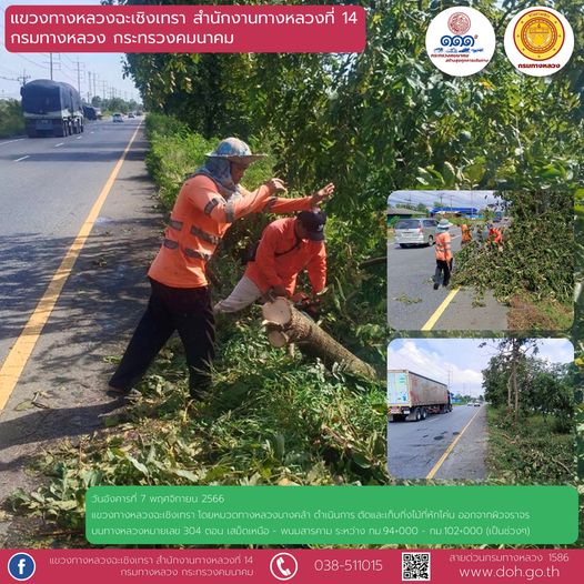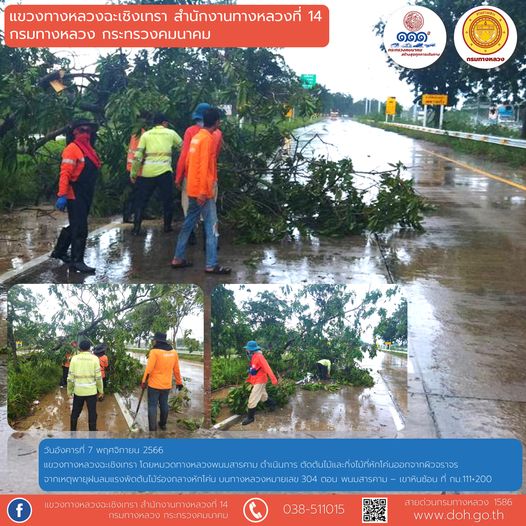 ตัดและเก็บกิ่งไม้ที่หักโค่นออกจากผิวจราจร |