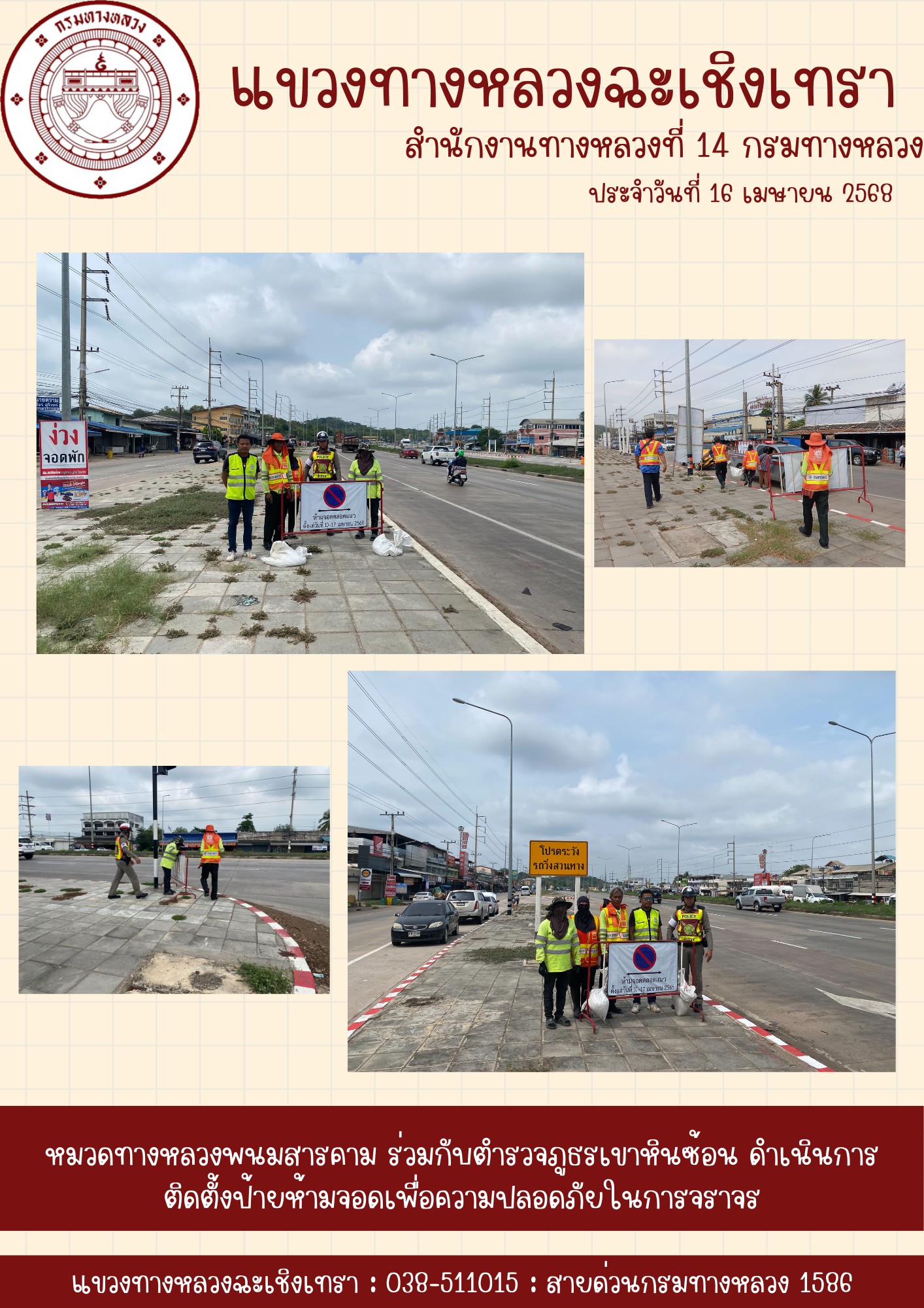 1433 16/04/2568 ดำเนินการติดตั้งป้ายห้ามจอดเพื่อความปลอดภัยในการจราจร