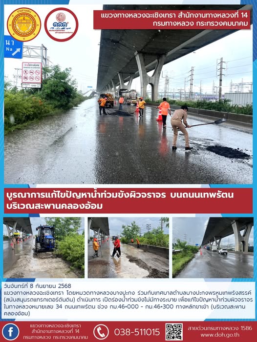 แขวงทางหลวงฉะเชิงเทรา โดยหมวดทางหลวงบางปะกง ร่วมกับเทศบาลตำบลบางปะกงพรหมเทพรังสรรค์ (สนับสนุนรถแทรกเตอร์ดันดิน) ดำเนินการ เปิดร่องน้ำท่วมขังไม่มีทางระบาย เพื่อแก้ไขปัญหาน้ำท่วมผิวจราจร ในทางหลวงหมายเลข 34 ถนนเทพรัตน ช่วง กม.46+000 - กม.46+300 ทางหลักขาเข้า (บริเวณสะพานคลองอ้อม)