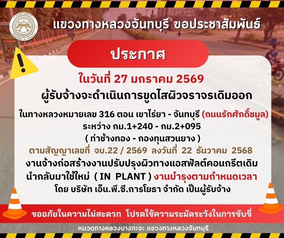 ดำเนินการขูดไสผิวจราจรเดิมออก ในทางหลวงหมายเลข 316 ตอน เขาไร่ยา - จันทบุรี (ถนนรักศักดิ์ชมูล)