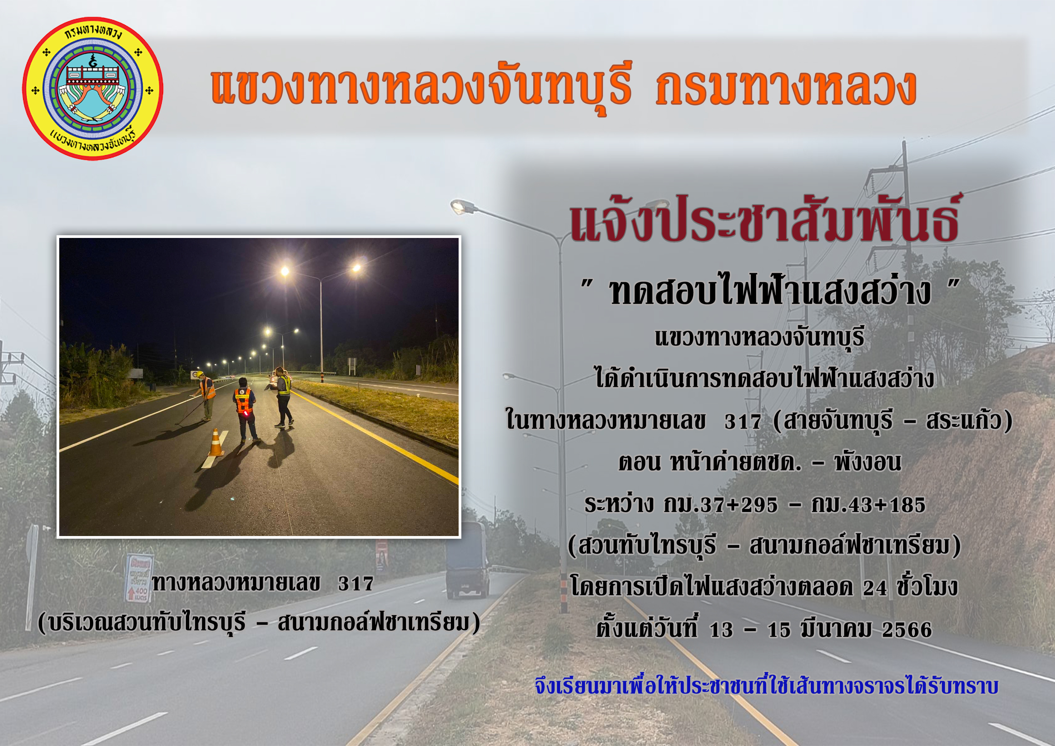 แขวงทางหลวงจันทบุรี ได้ดำเนินการทดสอบไฟฟ้าแสงสว่าง ในทางหลวงหมายเลข 317 (สายจันทบุรี - สระแก้ว)