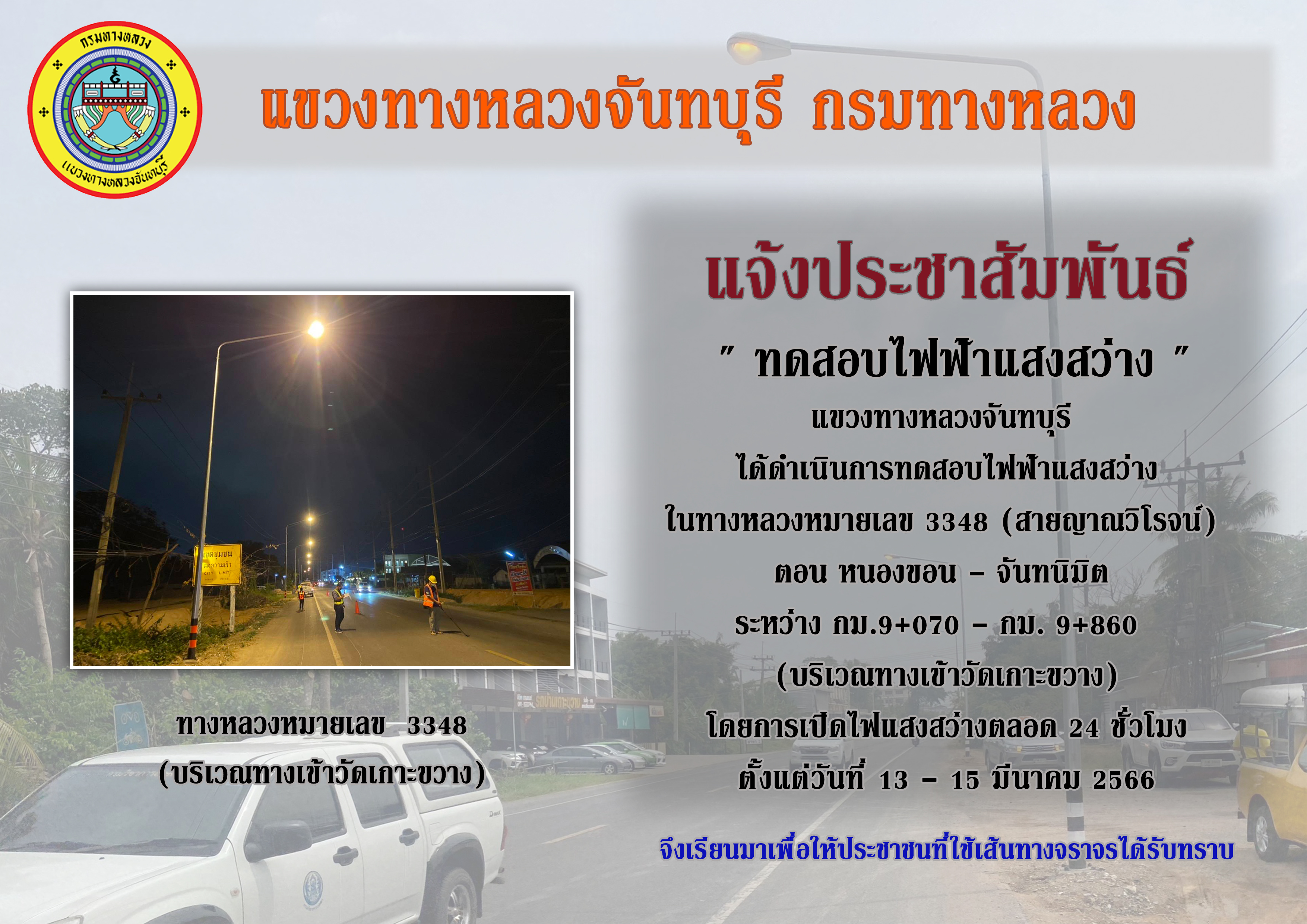 แขวงทางหลวงจันทบุรี ได้ดำเนินการทดสอบไฟฟ้าแสงสว่าง ในทางหลวงหมายเลข 3348 (สายญาณวิโรจน์)