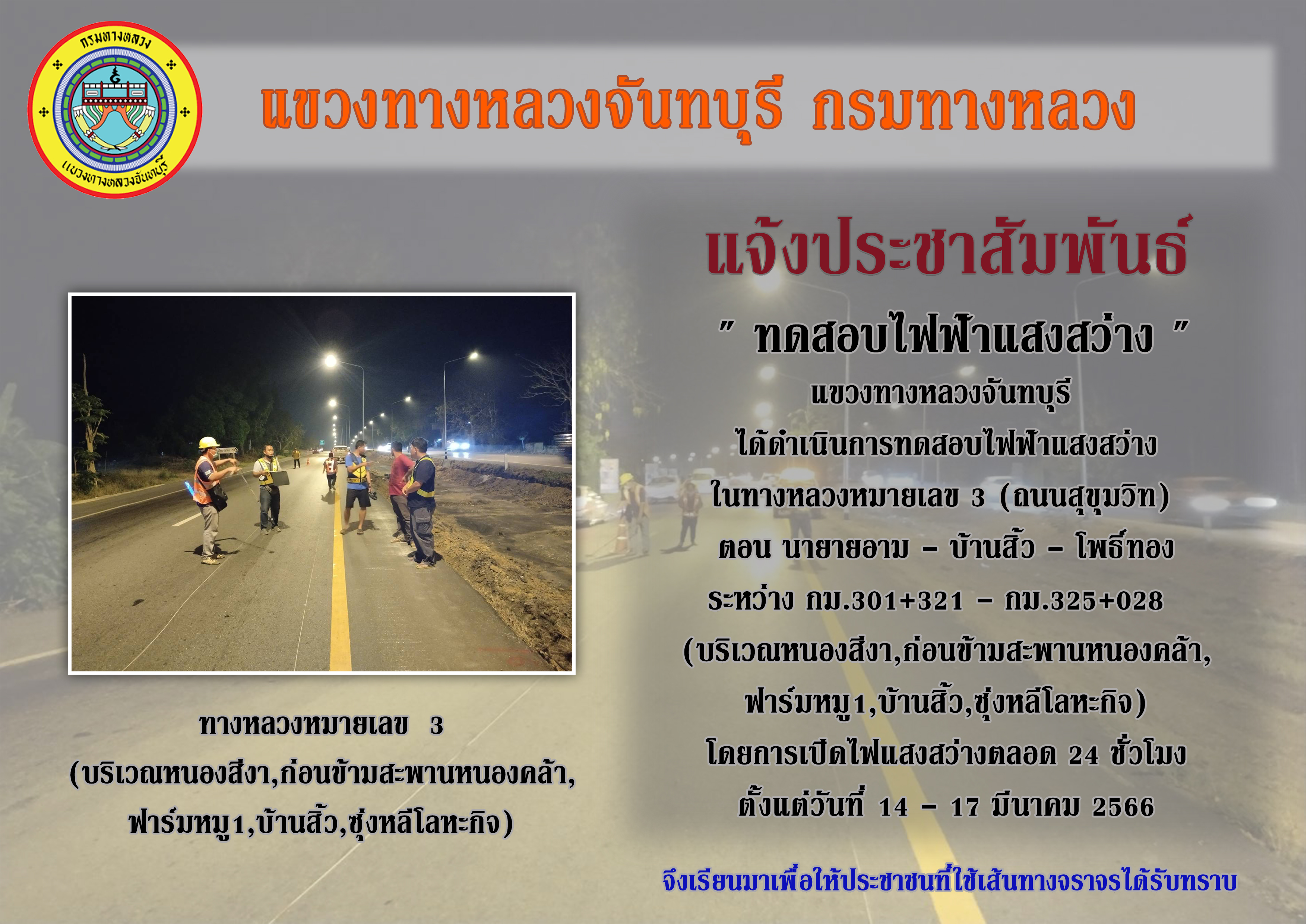แขวงทางหลวงจันทบุรี ได้ดำเนินการทดสอบไฟฟ้าแสงสว่าง ในทางหลวงหมายเลข 3 (ถนนสุขุมวิท)