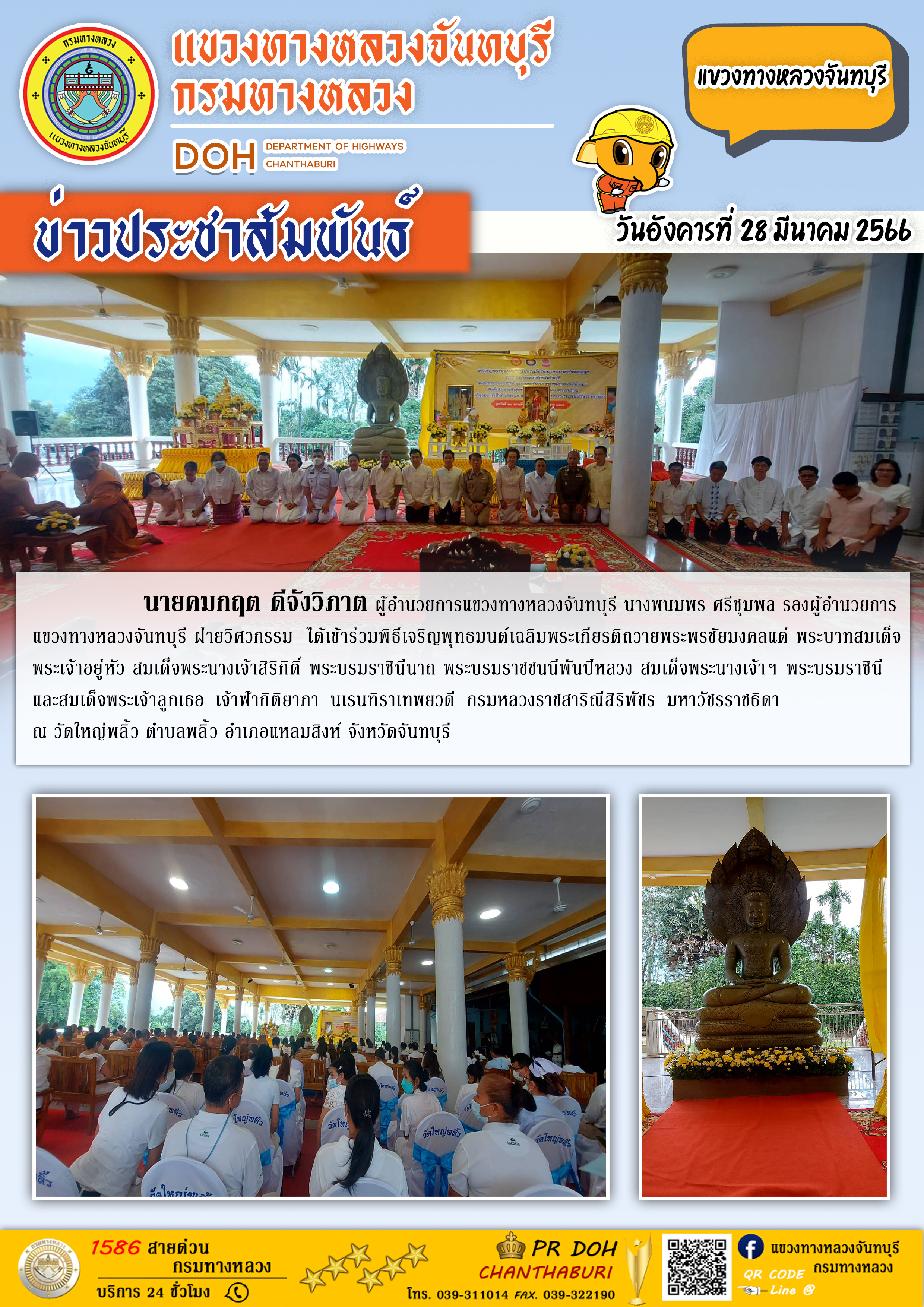 แขวงทางหลวงจันทบุรี ได้เข้าร่วมพิธีเจริญพุทธมนต์เฉลิมพระเกียรติถวายพระพรชัยมงคลแด่ พระบาทสมเด็จพระเจ้าอยู่หัว สมเด็จพระนางเจ้าสิริกิติ์ พระบรมราชินีนาถ พระบรมราชชนนีพันปีหลวง สมเด็จพระนางเจ้าฯ พระบรมราชินี และสมเด็จพระเจ้าลูกเธอ เจ้าฟ้ากิติยาภา นเรนทิราเทพยวดี กรมหลวงราชสาริณีสิริพัชร มหาวัชรราชธิดา