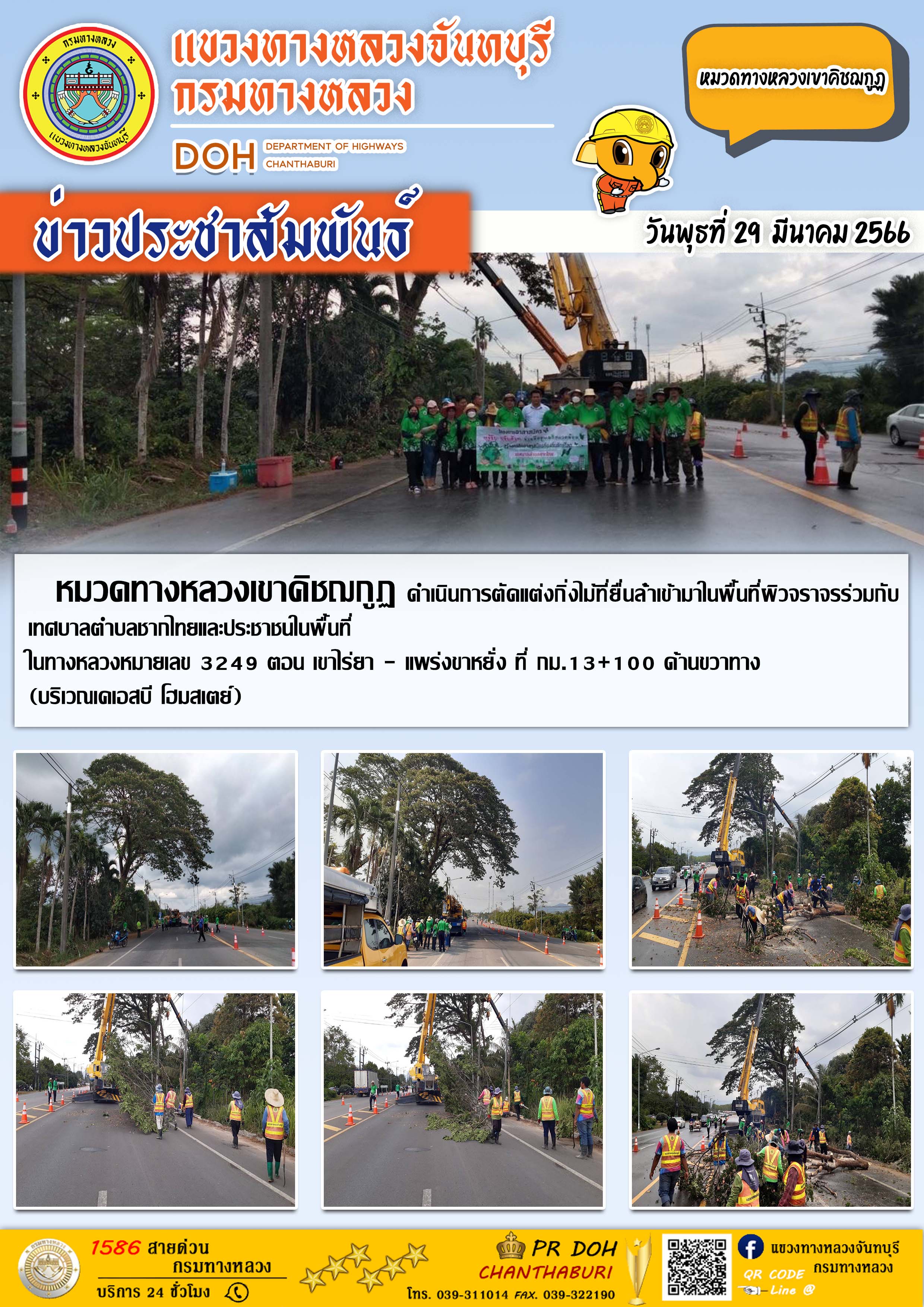 แขวงทางหลวงจันทบุรี หมวดทางหลวงเขาคิชฌกูฏ ร่วมกับเทศบาลตำบลชากไทยและประชาชนในพื้นที่ ดำเนินการตัดแต่งกิ่งไม้ที่ยื่นล้ำเข้ามาในพื้นที่ผิวจราจร