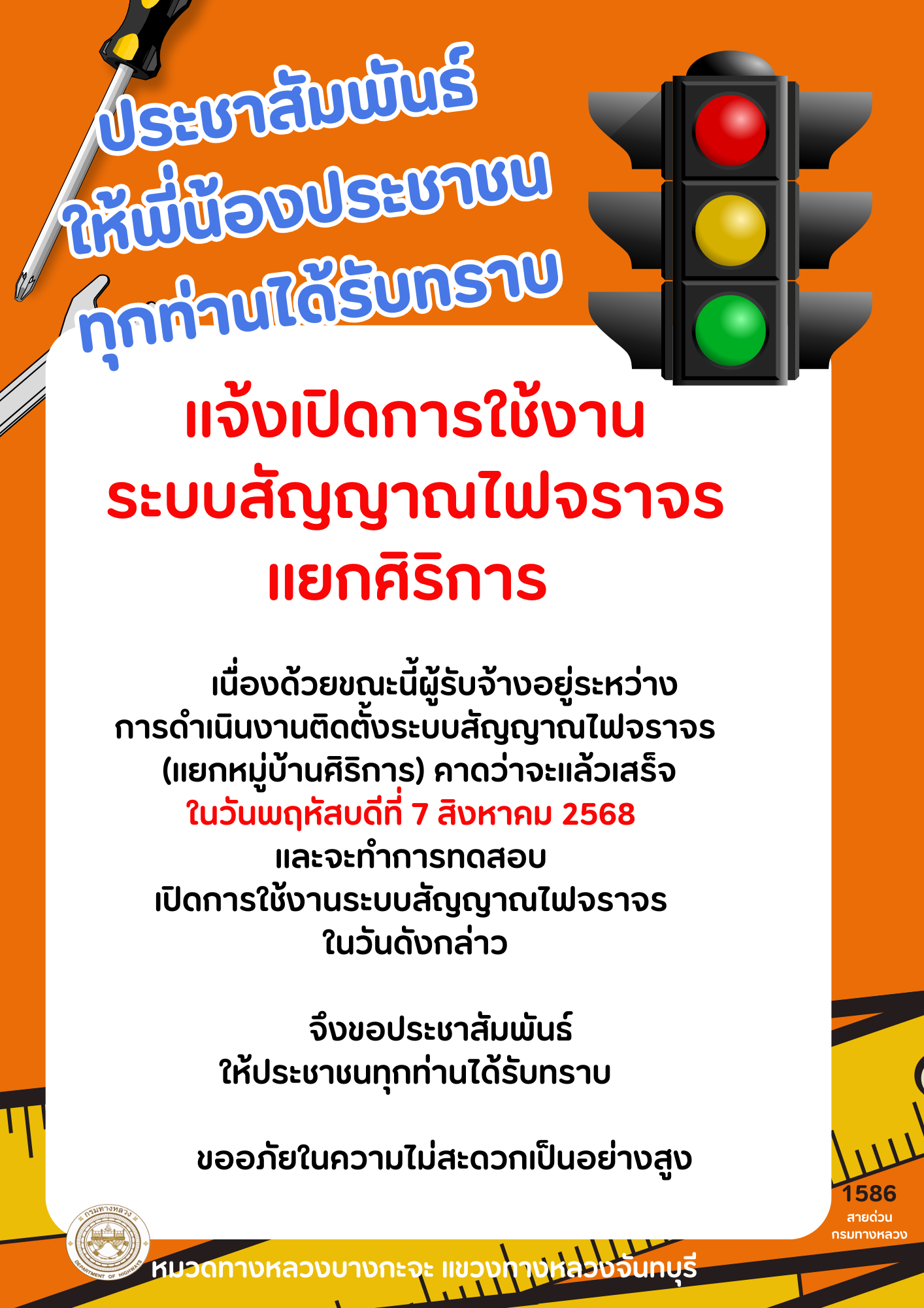 " แจ้งเปิดการใช้งาน ระบบสัญญาณไฟจราจร แยกศิริการ