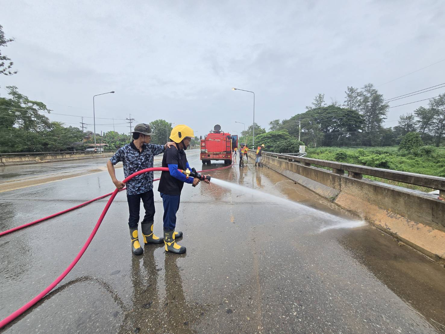 หมวดทางหลวงทับไทร แขวงทางหลวงจันทบุรี บริหารการจราจร เพื่อดำเนินการล้างผิวจราจร และ ทำความสะอาดช่องระบายน้ำ บริเวณสะพานคลองใหญ่ ร่วมกับ สำนักงานเทศบาลตำบลคลองใหญ่