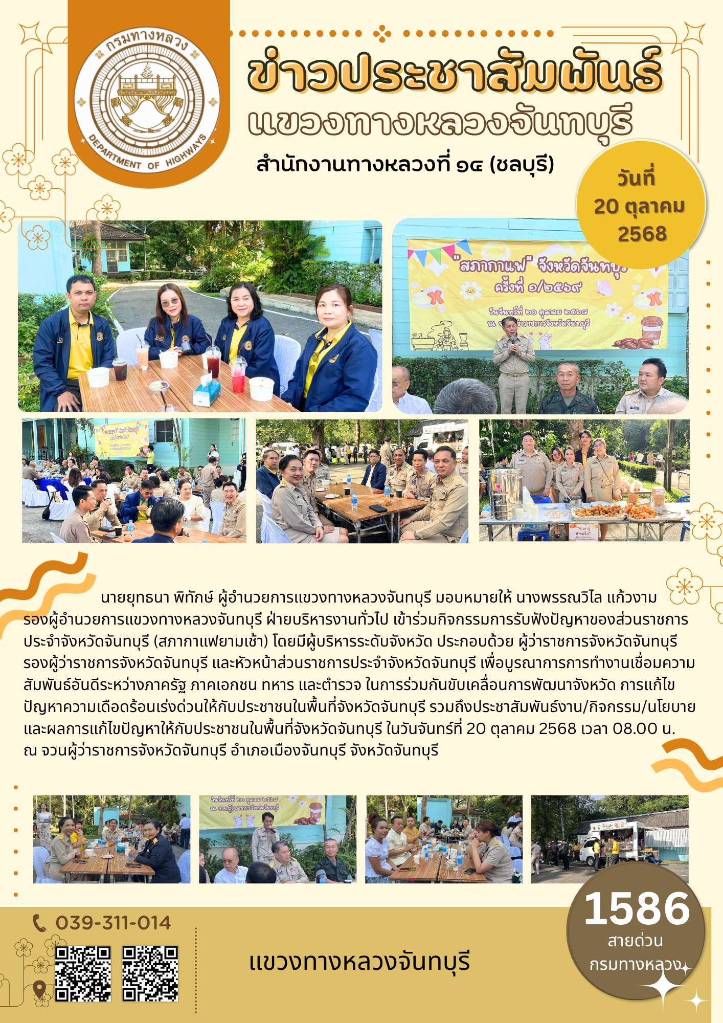 แขวงทางหลวงจันทบุรี เข้าร่วมกิจกรรมการรับฟังปัญหาของส่วนราชการประจำจังหวัดจันทบุรี (สภากาแฟยามเช้า)