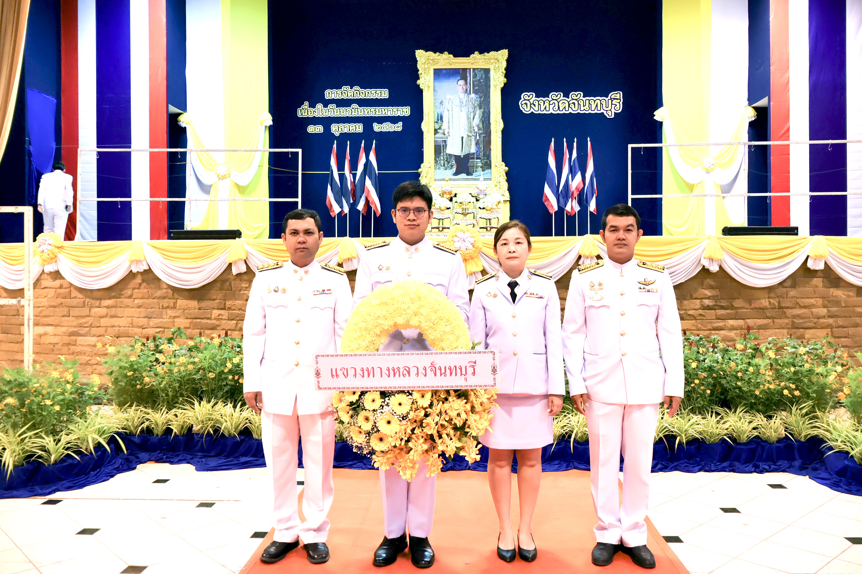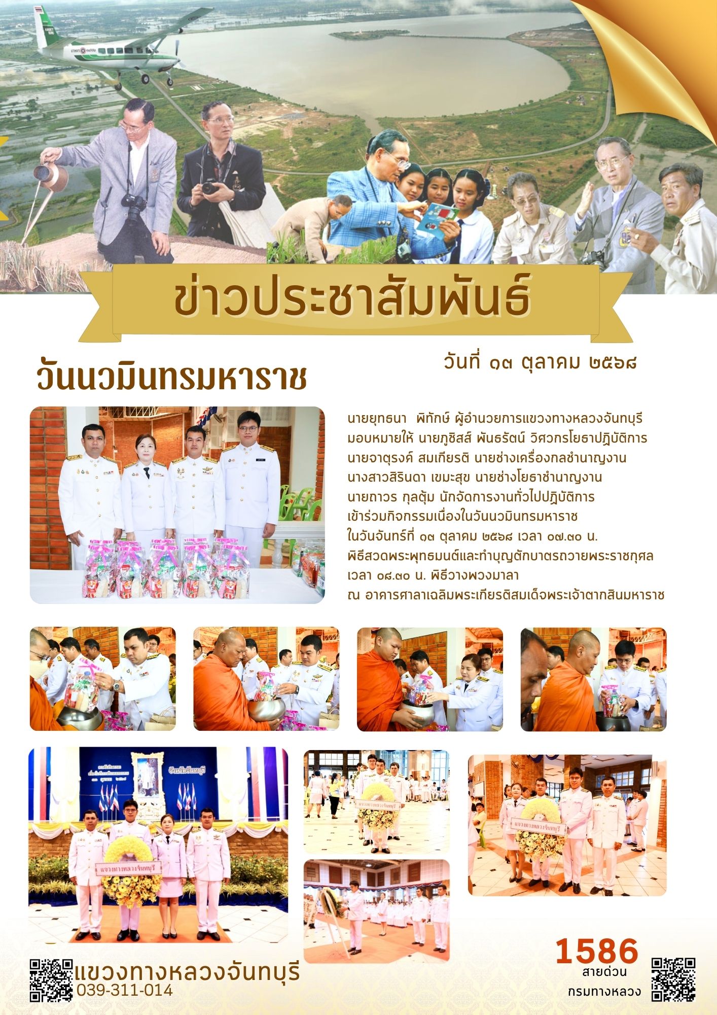 นายยุทธนา พิทักษ์ ผู้อำนวยการแขวงทางหลวงจันทบุร์ มอบหมายให้ นายภูชิสส์ พันธรัตน์ วิศวกรโยธาฏิบัติการ นายจาตุรงค์ สมเกียรติ นายช่างเครื่องกลชำนาญงาน นางสาวสิรินดา เขมะสุข นายช่างโยธาชำนาญงาน นายถาวร กุลตุ้ม นักจัดการงานทั่วไปปฎิบัติการ เข้าร่วมกิจกรรมเนื่องในวันนวมินทรมหาราช ในวันจันทร์ที่ 13 ตุลาคม 2568 เวลา 07.30 น. พิธีสวดพระพุทธมนต์และทำบุญตักบาตรถวายพระราชกุศล เวลา 08.30 น. พิธีวางพวงพวงมาลา ณ อาคารศาลาเฉลิมพระเกียรติสมเด็จพระเจ้าตากสินมหาราช