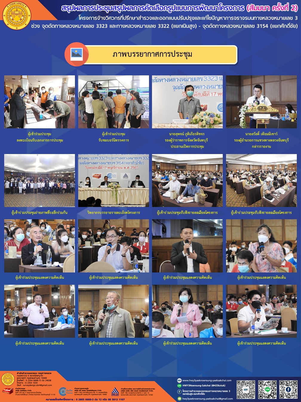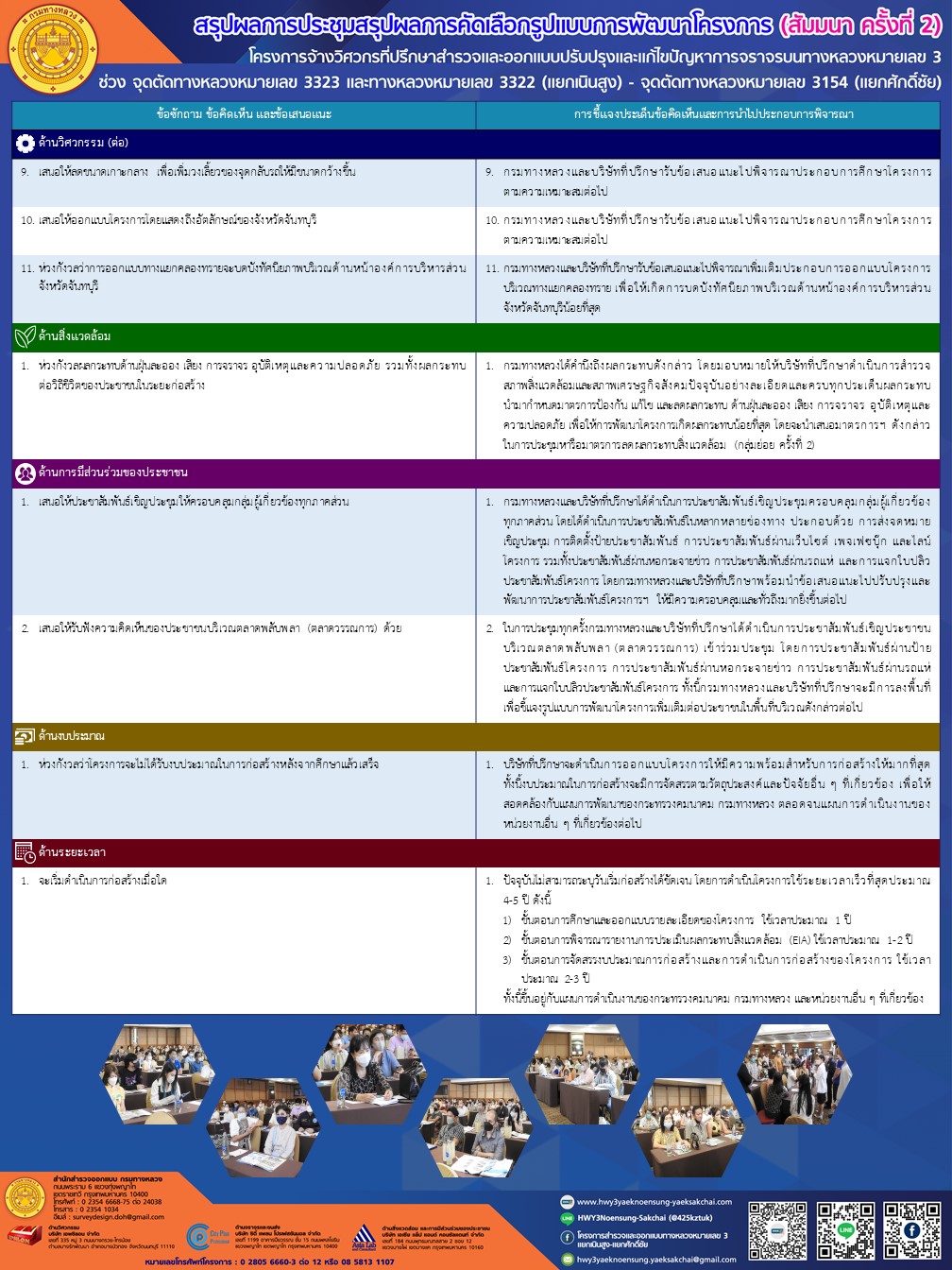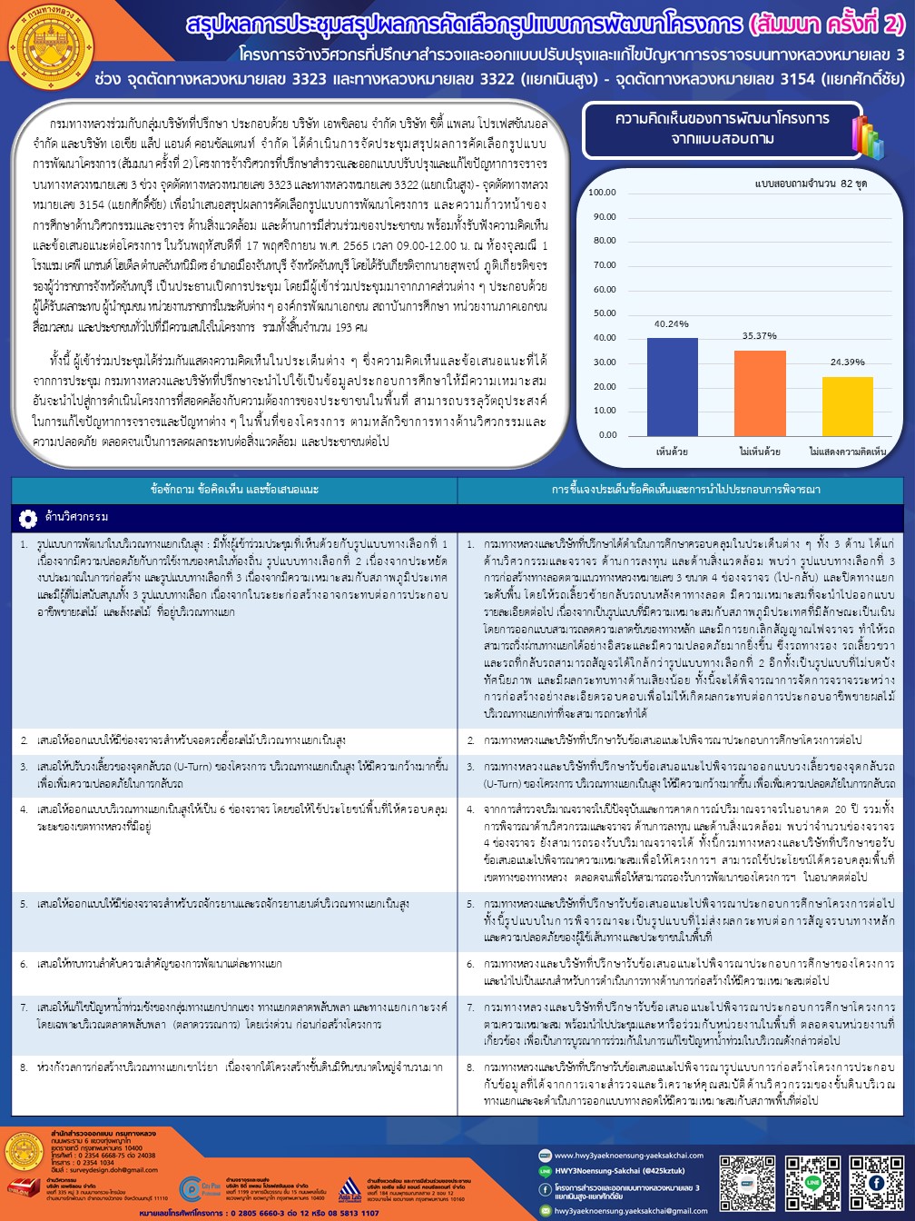 สรุปผลการประชุมสรุปผลการคัดเลือกรูปแบบการพัฒนาโครงการ (สัมมนา ครั้งที่ 2) โครงการจ้างวิศวกรที่ปรึกษาสำรวจและออกแบบปรับปรุงและแก้ไขปัญหาการจราจรบนทางหลวงหมายเลข 3 ช่วงจุดตัดทางหลวงหมายเลข 3323 และทางหลวงหมายเลข 3322 (แยกเนินสูง) - จุดตัดทางหลวงหมายเลข 3154 (แยกศักดิ์ชัย)