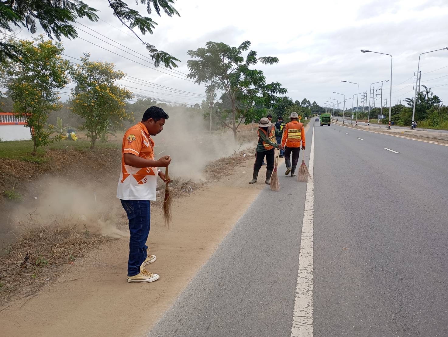 หมวดทางหลวงหนองตาคง แขวงทางหลวงจันทบุรี เทศบาลตำบลหนองตาคง ร่วมสนับสนุน ดำเนินการทำความสะอาดผิวจราจร