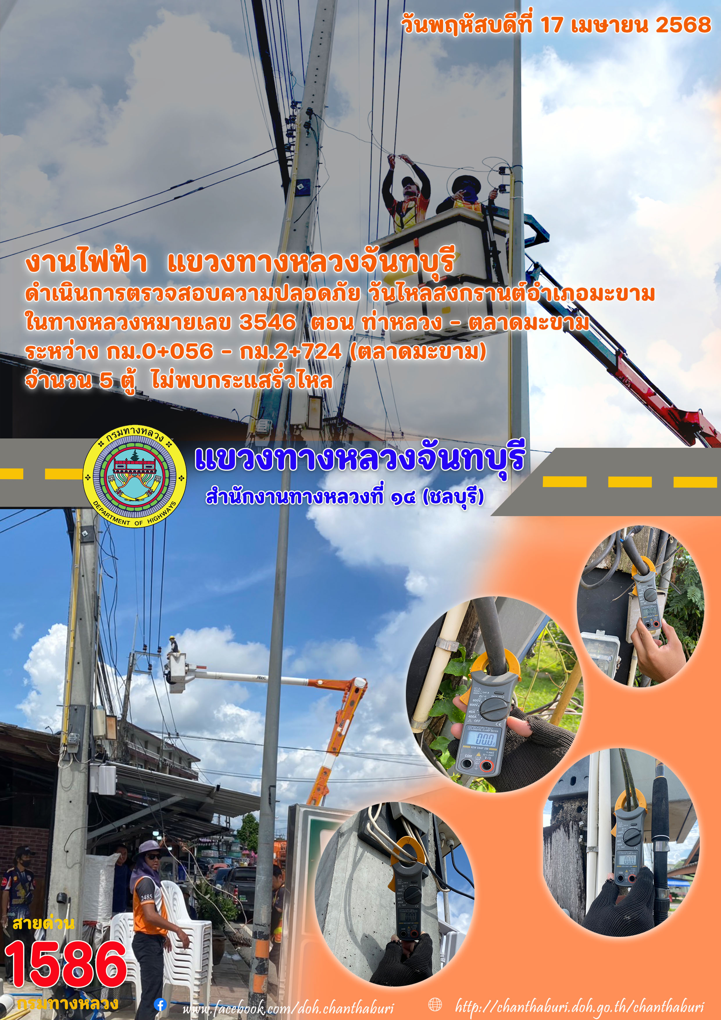 งานไฟฟ้า แขวงทางหลวงจันทบุรี ดำเนินการตรวจสอบความปลอดภัย วันไหลสงกรานต์อำเภอมะขาม ในทางหลวงหมายเลข 3546 ตอน ท่าหลวง - ตลาดมะขามระหว่าง กม.0+056 - กม.2+724 (ตลาดมะขาม) จำนวน 5 ตู้ ไม่พบกระแสรั่วไหล