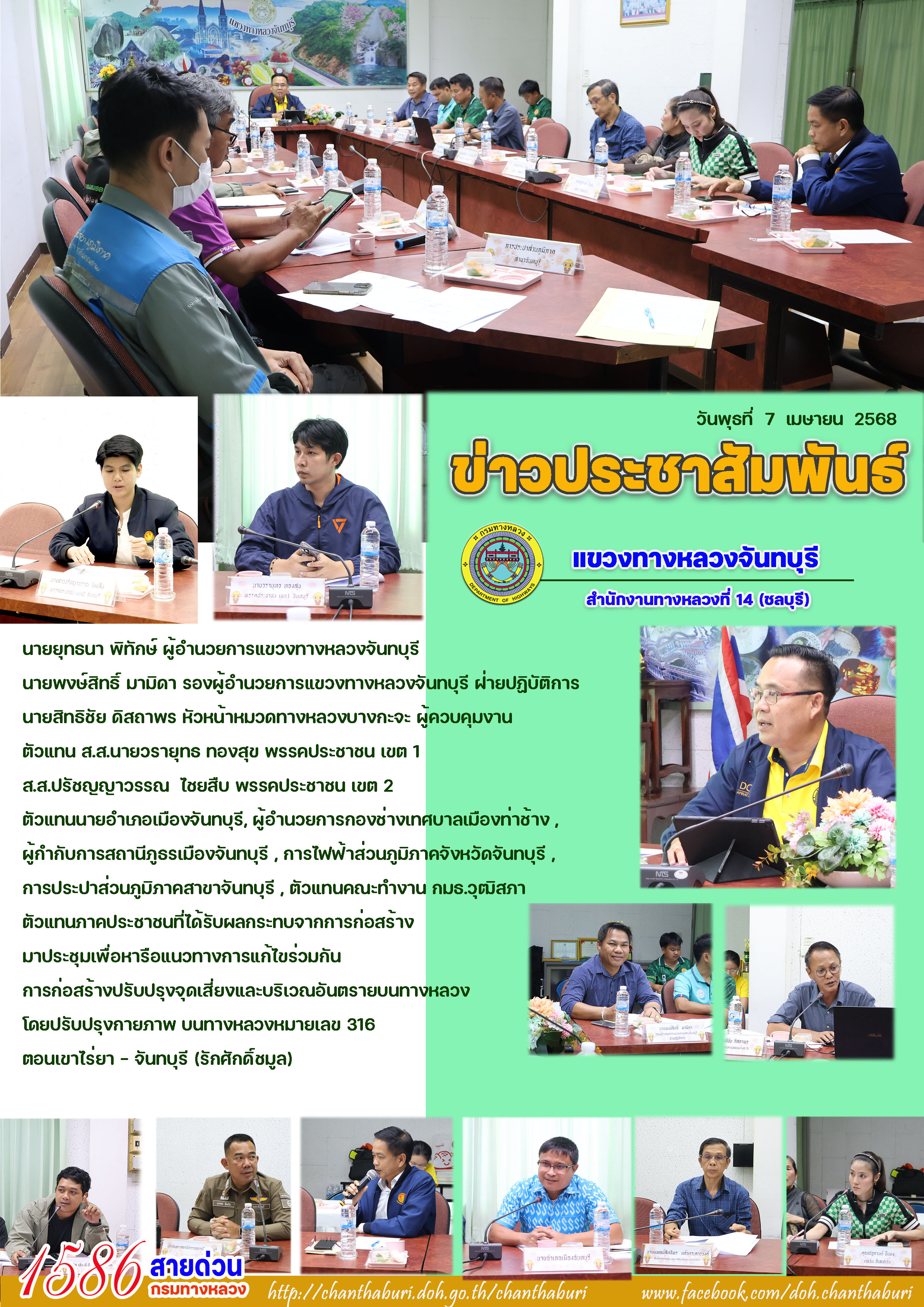 นายยุทธนา พิทักษ์ ผู้อำนวยการแขวงทางหลวงจันทบุรี นายพงษ์สิทธิ์ มามิดา รองผู้อำนวยการแขวงทางหลวงจันทบุรี ฝ่ายปฏิบัติการ นายสิทธิชัย ดิสถาพร หัวหน้าหมวดทางหลวงบางกะจะ ผู้ควบคุมงาน ตัวแทน ส.ส.นายวรายุทธ ทองสุข พรรคประชาชน เขต 1 ส.ส.ปรัชญญาวรรณ ไชยสืบ พรรคประชาชน เขต 2 ตัวแทนนายอำเภอเมืองจันทบุรี, ผู้อำนวยการกองช่างเทศบาลเมืองท่าช้าง , ผู้กำกับการสถานีภูธรเมืองจันทบุรี , การไฟฟ้าส่วนภูมิภาคจังหวัดจันทบุรี , การประปาส่วนภูมิภาคสาขาจันทบุรี , ตัวแทนคณะทำงาน กมธ.วุฒิสภา ตัวแทนภาคประชาชนที่ได้รับผลกระทบจากการก่อสร้าง มาประชุมเพื่อหารือแนวทางการแก้ไขร่วมกัน การก่อสร้างปรับปรุงจุดเสี่ยงและบริเวณอันตรายบนทางหลวง โดยปรับปรุงกายภาพ บนทางหลวงหมายเลข 316 ตอนเขาไร่ยา - จันทบุรี (รักศักดิ์ชมูล)