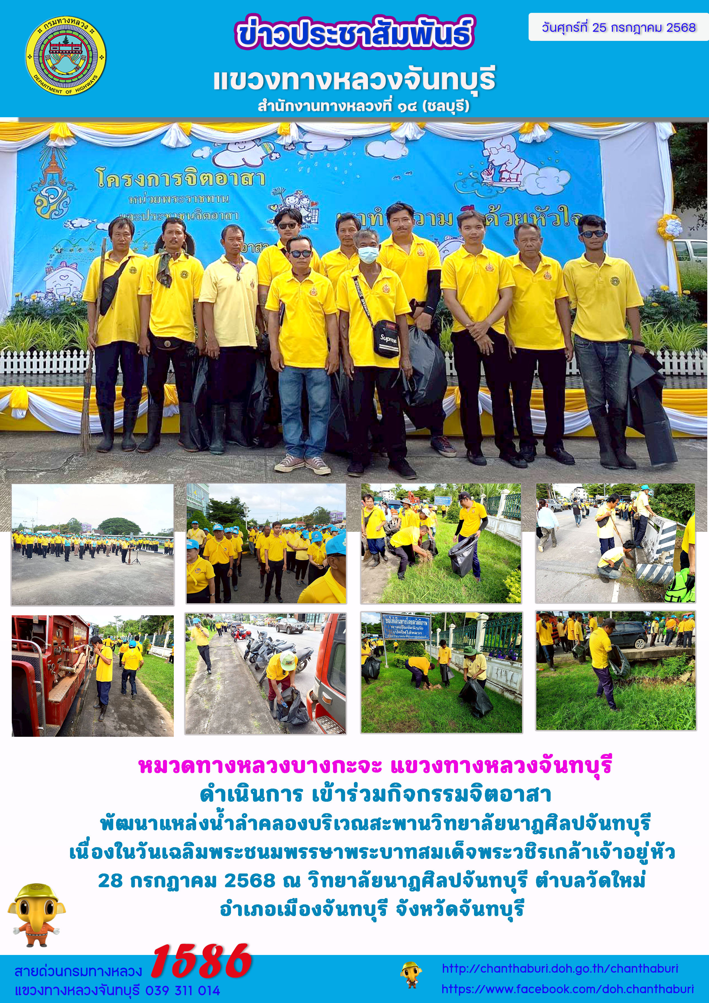 หมวดทางหลวงบางกะจะ แขวงทางหลวงจันทบุรีดำเนินการ เข้าร่วมกิจกรรมจิตอาสาพัฒนาแหล่งน้ำลำคลองบริเวณสะพานวิทยาลัยนาฎศิลปจันทบุรีเนื่องในวันเฉลิมพระชนมพรรษาพระบาทสมเด็จพระวชิรเกล้าเจ้าอยู่หัว 28 กรกฏาคม 2568 ณ วิทยาลัยนาฎศิลปจันทบุรี ตำบลวัดใหม่ อำเภอเมืองจันทบุรี จังหวัดจันทบุรี