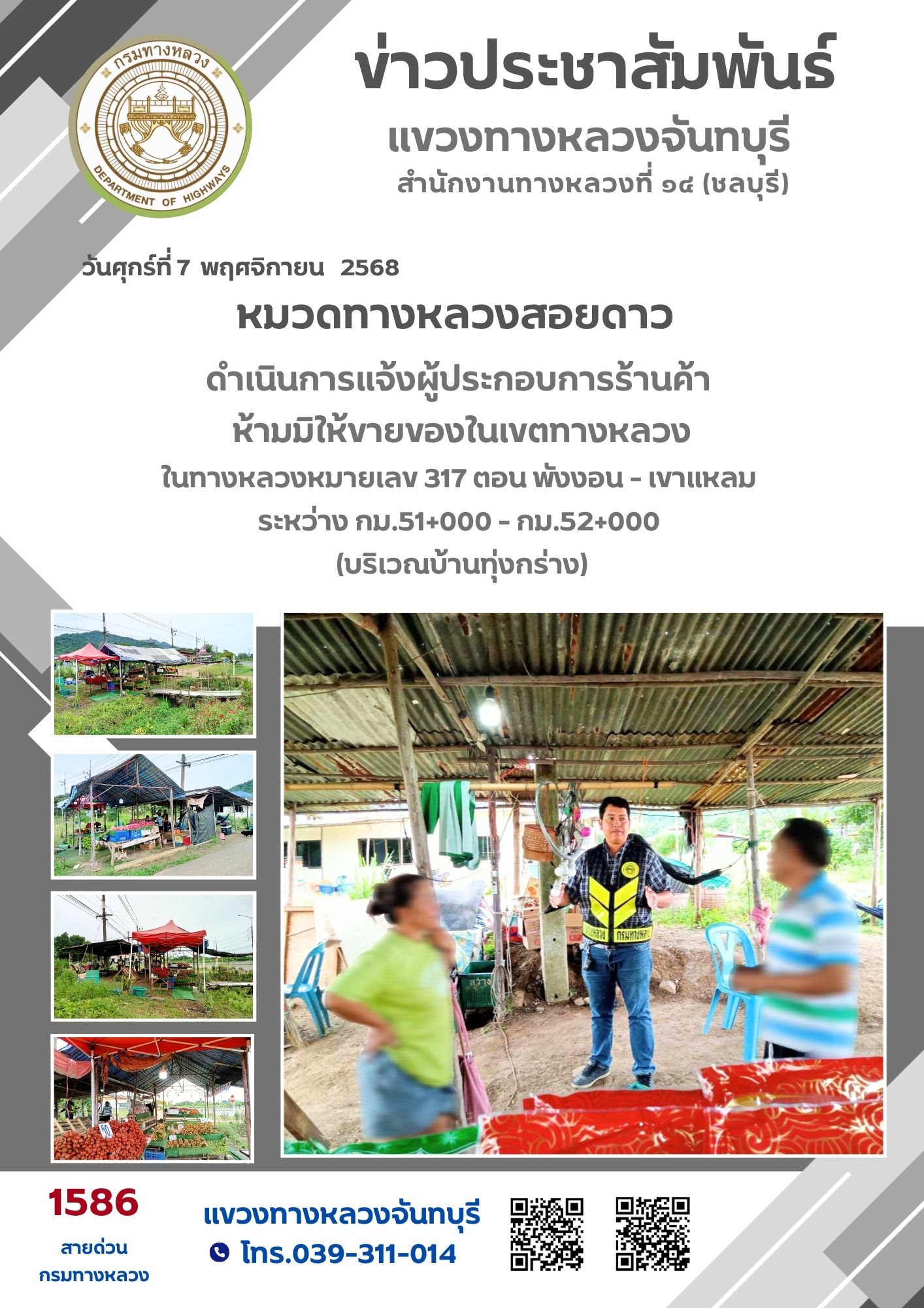 หมวดทางหลวงสอยดาว แขวงทางหลวงจันทบุรี ดำเนินการแจ้งผู้ประกอบการร้านค้า ห้ามมิให้ขายของในเขตทางหลวง