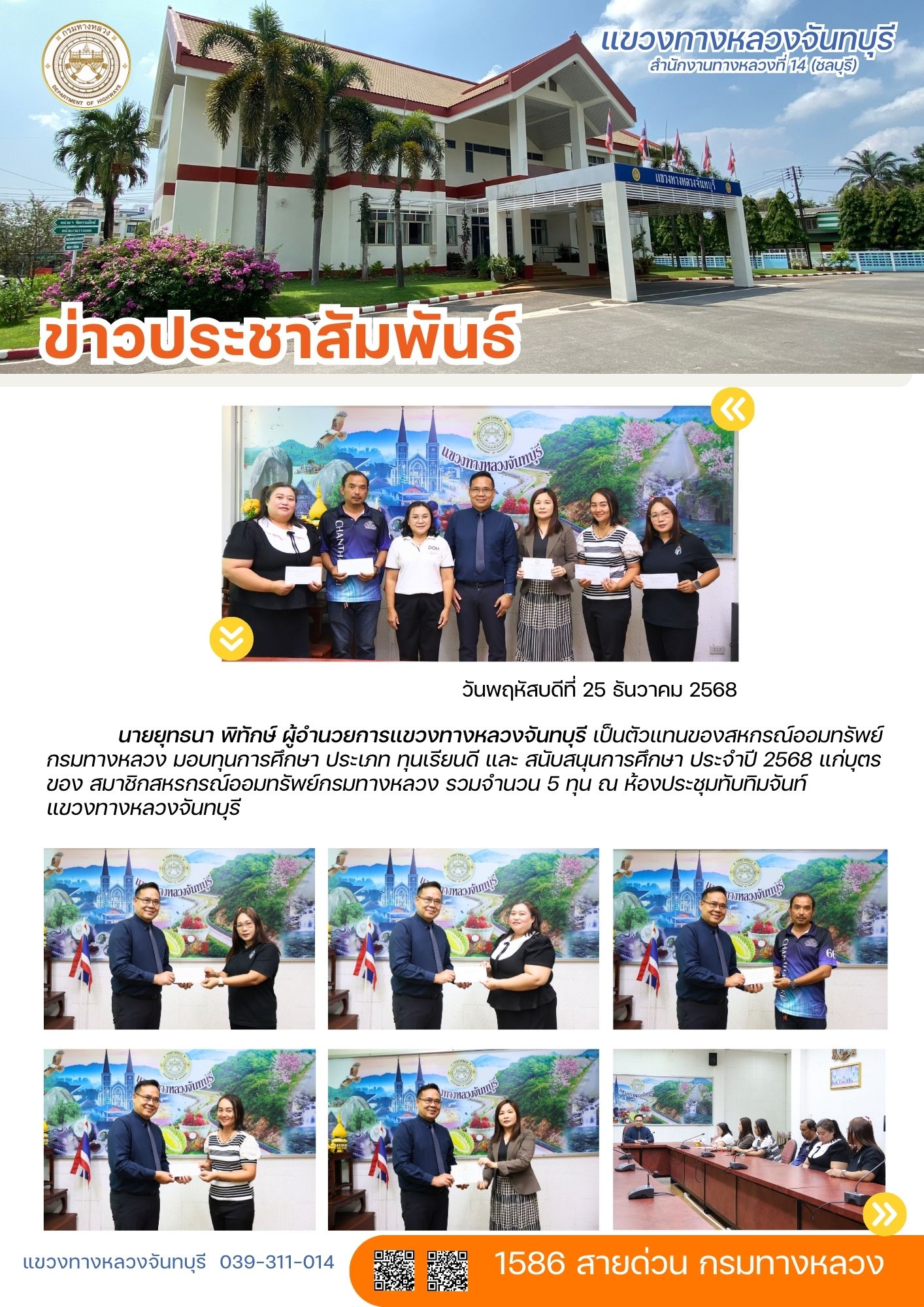 นายยุทธนา พิทักษ์ ผู้อำนวยการแขวงทางหลวงจันทบุรี เป็นตัวแทนของสหกรณ์ออมทรัพย์กรมทางหลวง มอบทุนการศึกษา ประเภท ทุนเรียนดี และ สนับสนุนการศึกษา ประจำปี 2568 แก่บุตรของ สมาชิกสหรกรณ์ออมทรัพย์กรมทางหลวง รวมจำนวน 5 ทุน ณ ห้องประชุมทับทิมจันท์ แขวงทางหลวงจันทบุรี