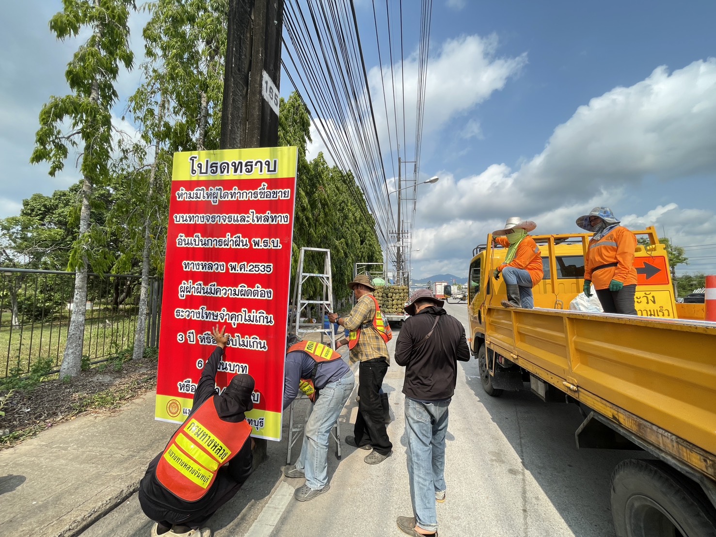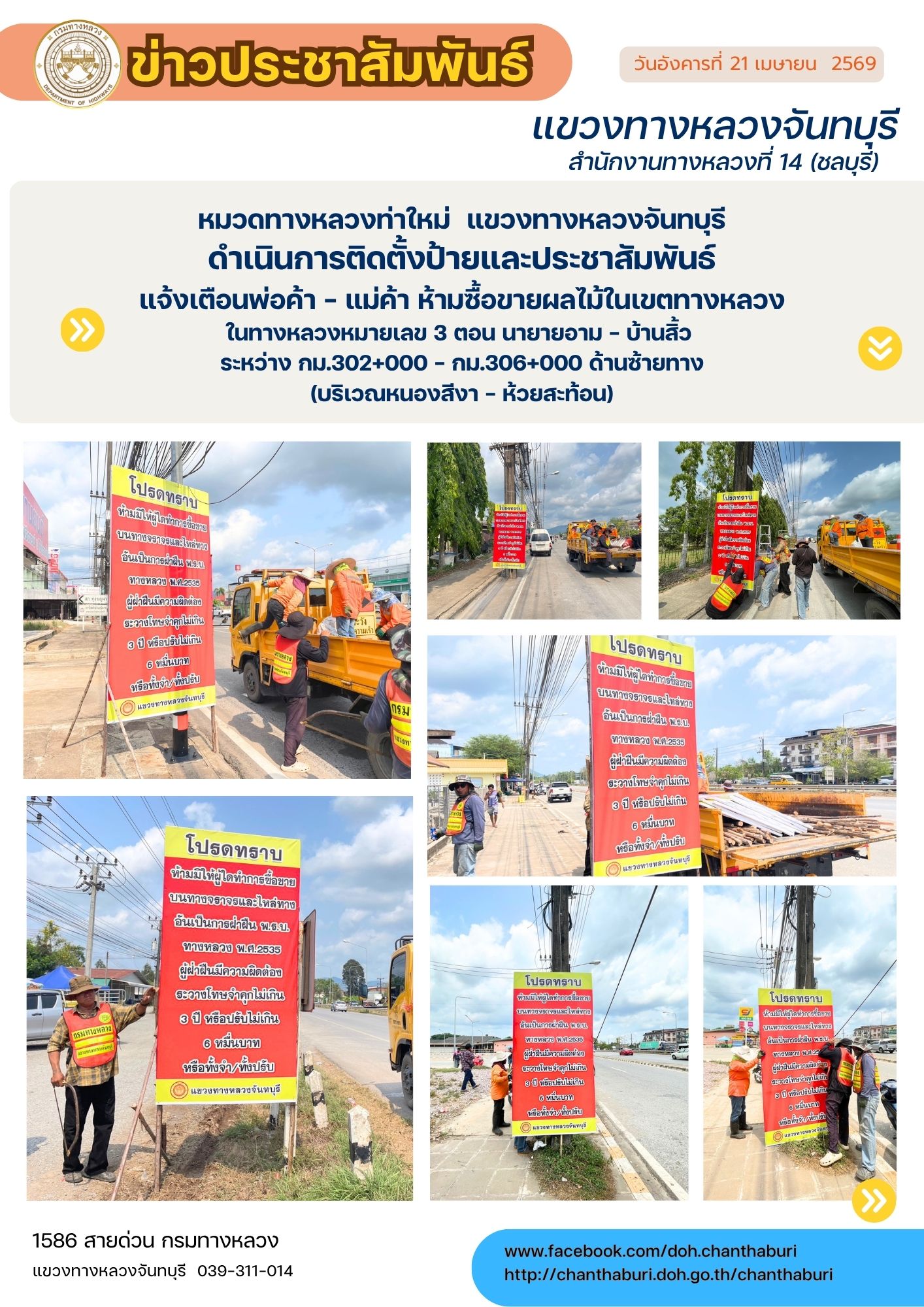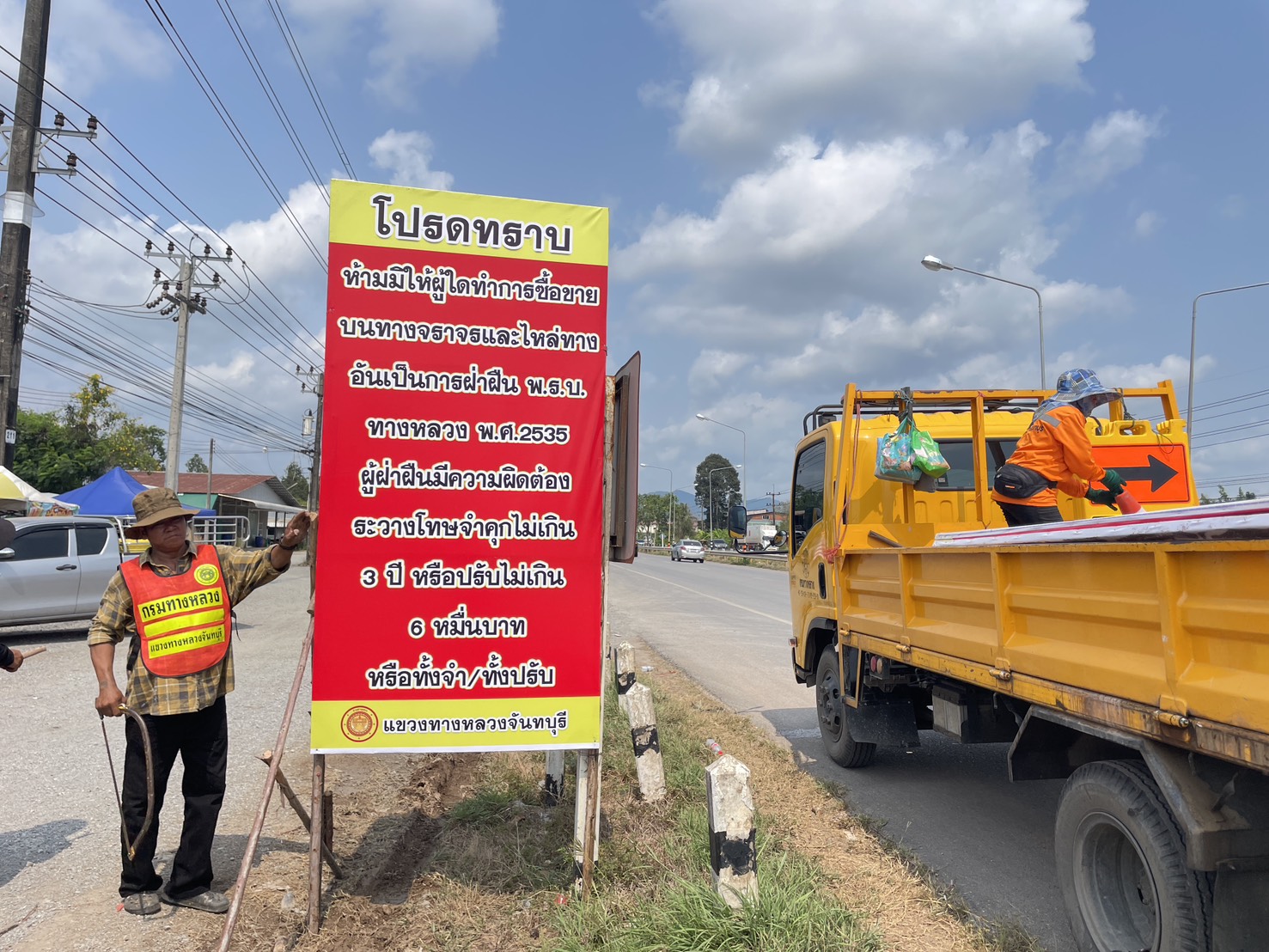 หมวดทางหลวงท่าใหม่ แขวงทางหลวงจันทบุรี ดำเนินการติดตั้งป้ายและประชาสัมพันธ์ แจ้งเตือนพ่อค้า - แม่ค้า ห้ามซื้อขายผลไม้ในเขตทางหลวง