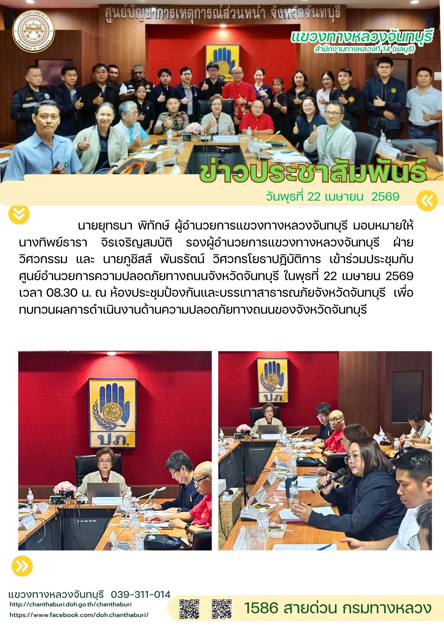 นายยุทธนา พิทักษ์ ผู้อำนวยการแขวงทางหลวงจันทบุรี มอบหมายให้ นางทิพย์ธารา จิรเจริญสมบัติ รองผู้อำนวยการแขวงทางหลวงจันทบุรี ฝ่ายวิศวกรรม และ นายภูชิสส์ พันธรัตน์ วิศวกรโยธาปฎิบัติการ เข้าร่วมประชุมกับศูนย์อำนวยการความปลอดภัยทางถนนจังหวัดจันทบุรี ในพุธที่ 22 เมษายน 2569 เวลา 08.30 น. ณ ห้องประชุมป้องกันและบรรเทาสาธารณภัยจังหวัดจันทบุรี เพื่อทบทวนผลการดำเนินงานด้านความปลอดภัยทางถนนของจังหวัดจันทบุรี