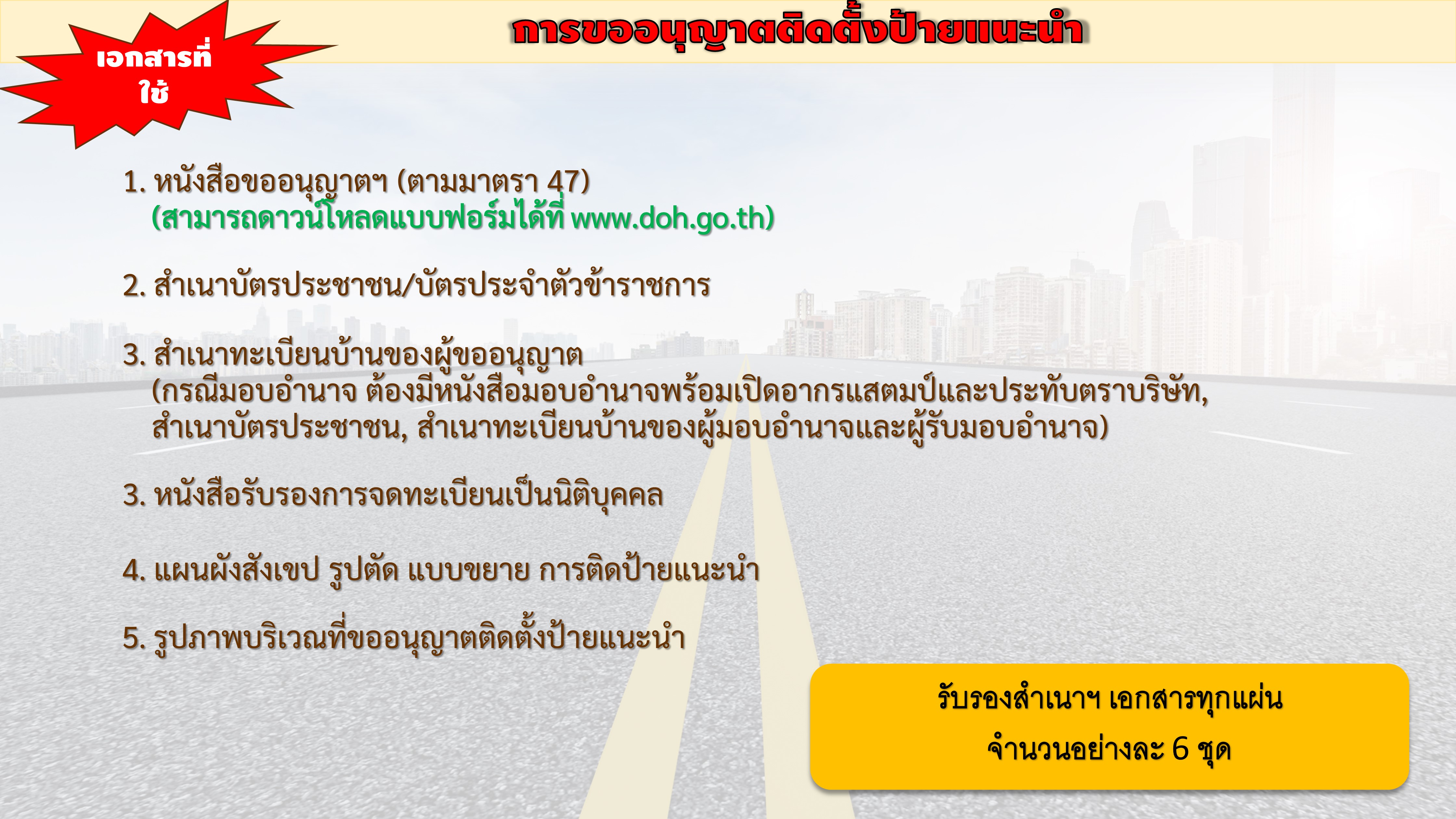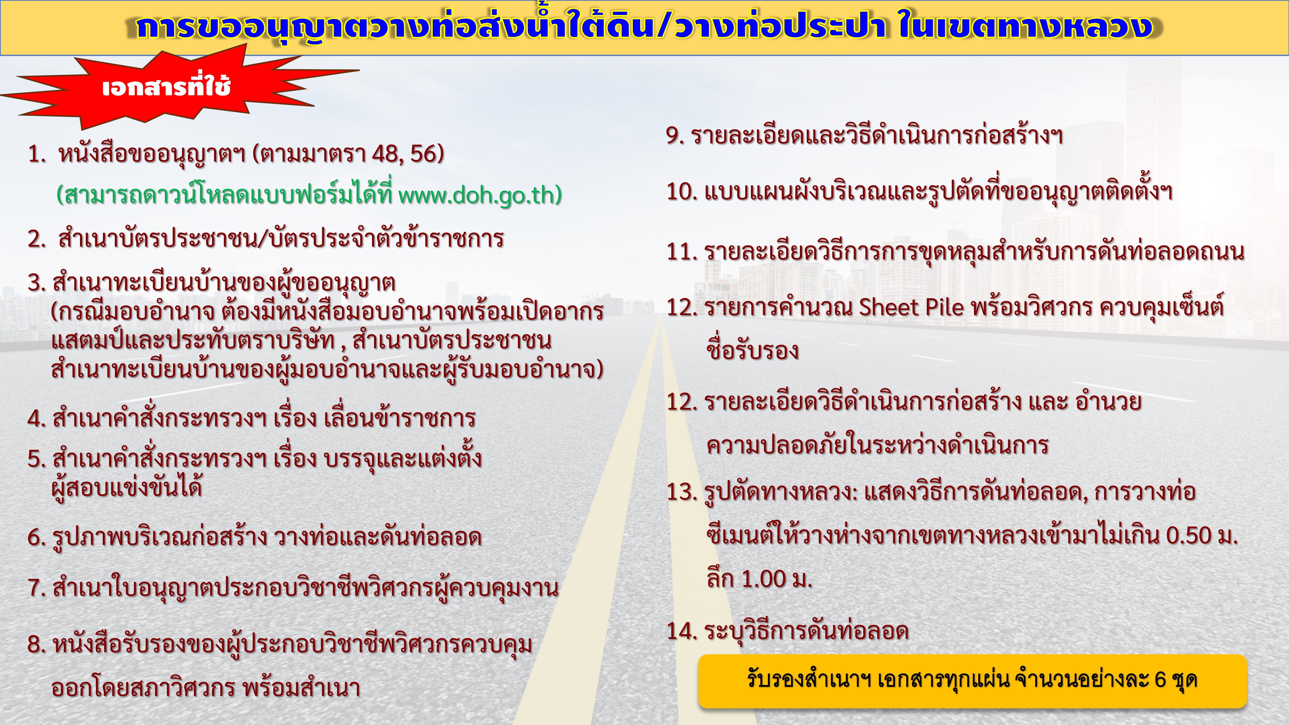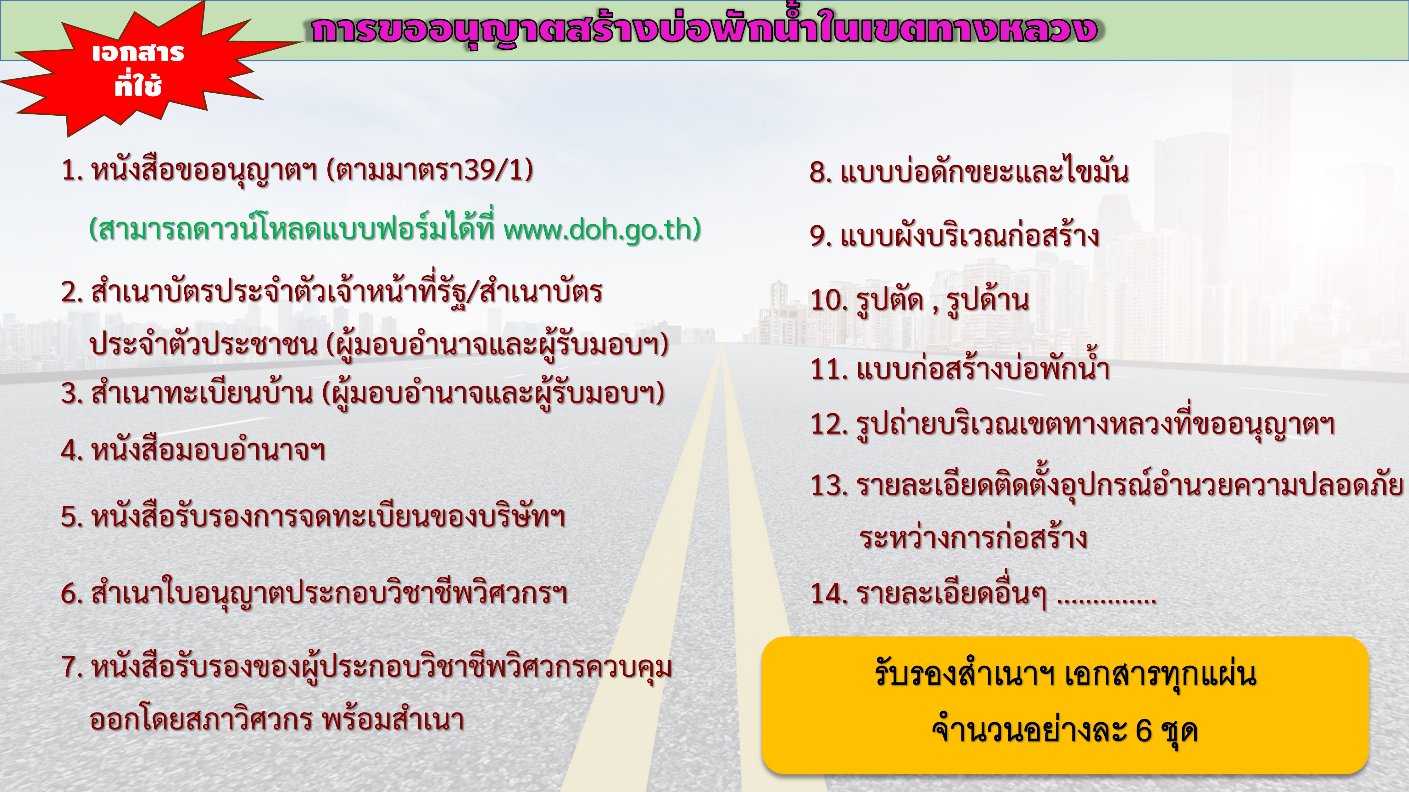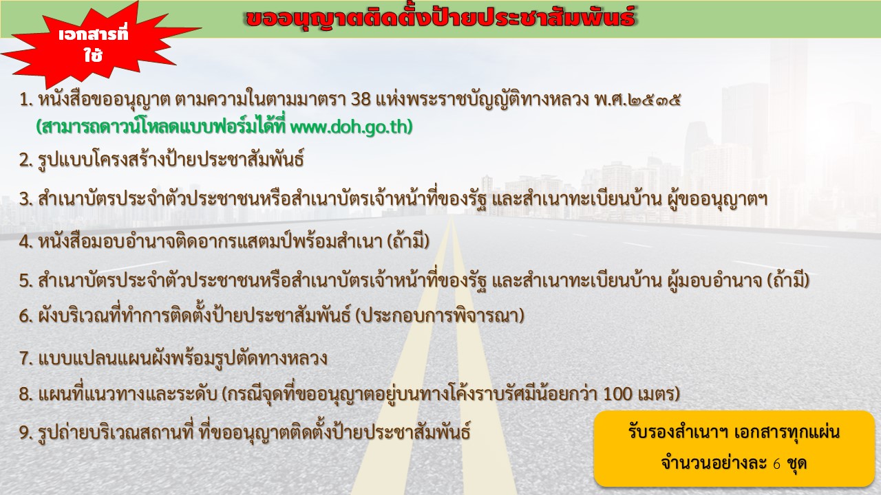 | คำขออนุญาต 47 คำขออนุญาตดำเนินการใดๆ ในเขตทางหลวง ศาลา ป้าย ก่อสร้างถนน ปรับปรุง | 175 | ดาวน์โหลด |