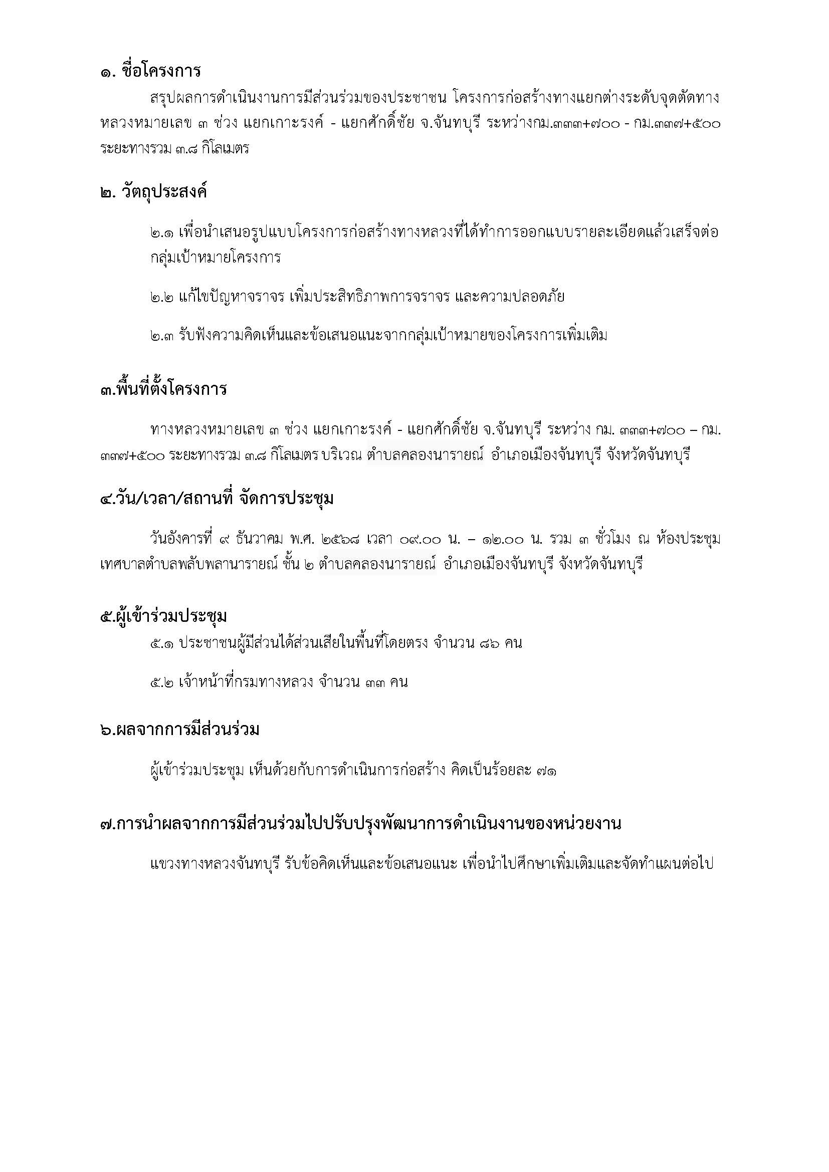 สรุปผลการดำเนินงานการมีส่วนร่วมของประชาชน โครงการก่อสร้างทางแยกต่างระดับจุดตัดทางหลวงหมายเลข 3 ช่วง แยกเกาะรงค์ - แยกศักดิ์ชัย จ.จันทบุรี ระหว่างกม.333+700 - กม.337+500 ระยะทางรวม 3.8 กิโลเมตร