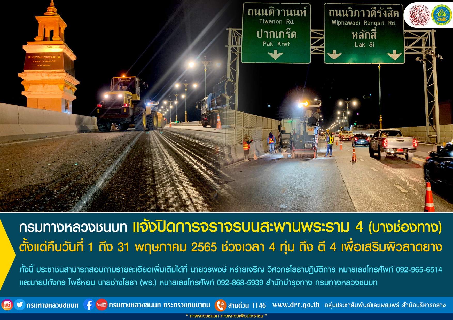 กรมทางหลวงชนบท แจ้งปิดการจราจรบนสะพานพระราม 4 (บางช่องทาง) ตั้งแต่คืนวันที่ 1 - 31 พฤษภาคม 2565 ช่วงเวลา 4 ทุ่ม - ตี 4 เพื่อเสริมผิวลาดยาง