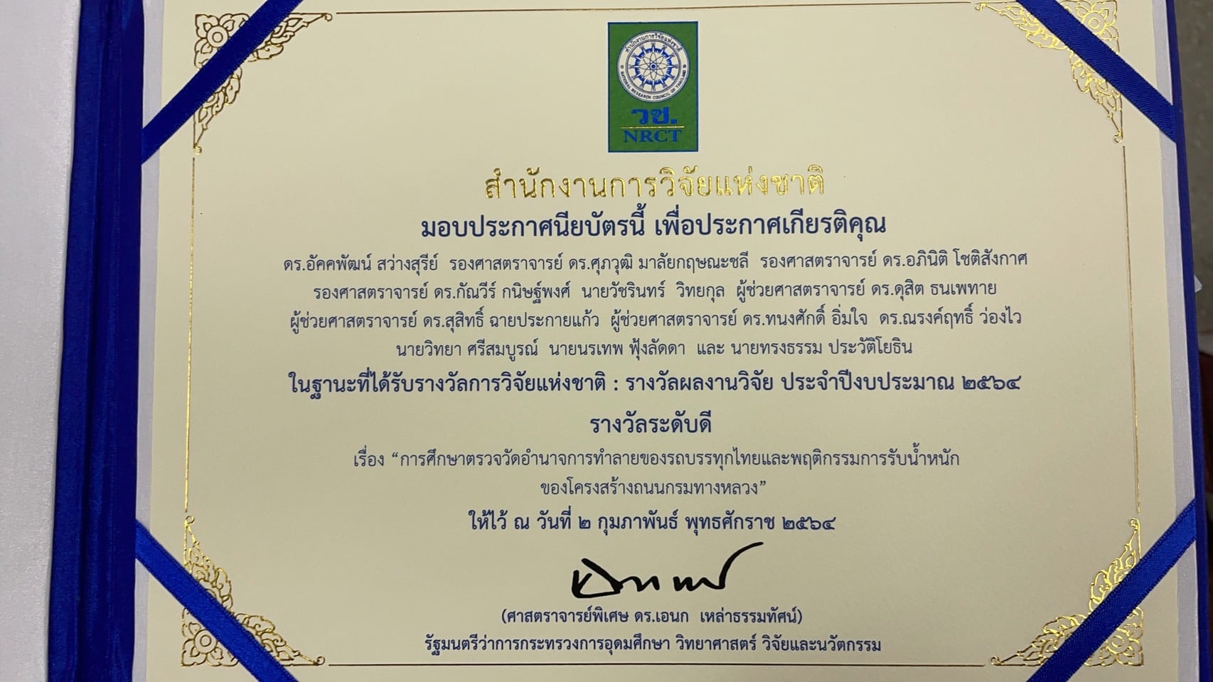 - รางวัลผลงานวิจัยระดับดี ประจำปี 2564 จาก สำนักงานการวิจัยแห่งชาติ (วช ) จากผลงานทางวิชาการเรื่อง การศึกษาตรวจวัดอำนาจการทำลายของรถบรรทุกไทยและพฤติกรรมการรับน้ำหนักของโครงสร้างถนนกรมทางหลวง “Field Monitoring of Road Pavement Responses and their Performance in Thailand” และ วช. ได้กำหนดจัดพิธีมอบรางวัลการวิจัยแห่งชาติ : รางวัลผลงานวิจัย รางวัลวิทยานิพนธ์ และรางวัลผลงานประดิษฐ์คิดค้น ประจำปีงบประมาณ 2564 ภายในงาน “วันนักประดิษฐ์” ประจำปี 2564 แต่เนื่องจาก สถานการณ์การแพร่ระบาดของโรคติดเชื้อไวรัสโคโรนา 2019 (โควิด-19) มีการแพร่ระบาดรุนแรง วช. จึงยังไม่สามารถดำเนินการจัดพิธีมอบรางวัลฯ ดังกล่าวได้