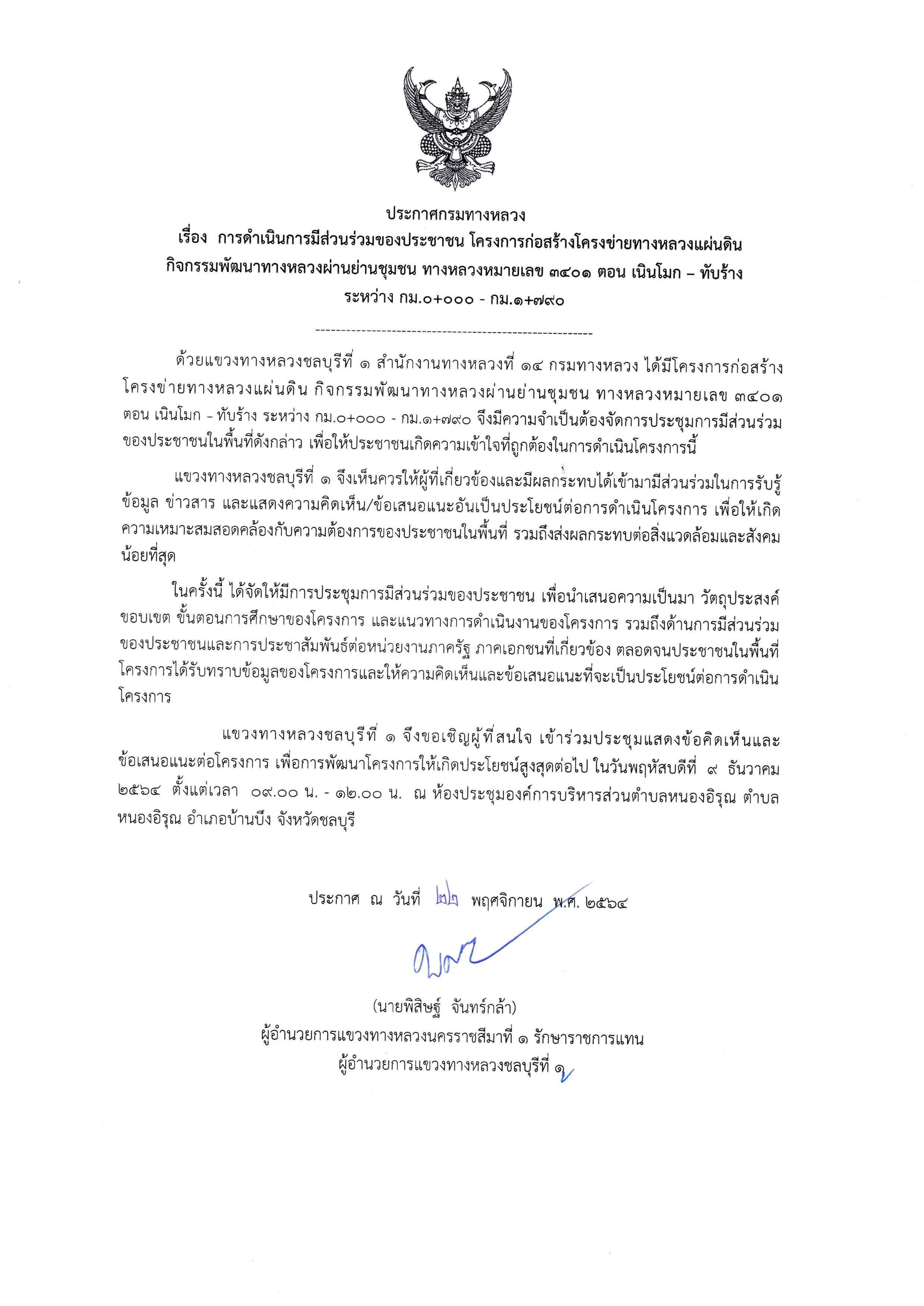 ประกาศกรมทางหลวง เรื่อง การดำเนินการมีส่วนร่วมของประชาชน โครงการก่อสร้างโครงข่ายทางหลวงแผ่นดิน กิจกรรมพัฒนาทางหลวงผ่านย่านชุมชน ทาลหลวงหมายเลข 3401 ตอน เนินโมก - ทับร้าง ระหว่าง กม. 0+000 - กม. 1+790
