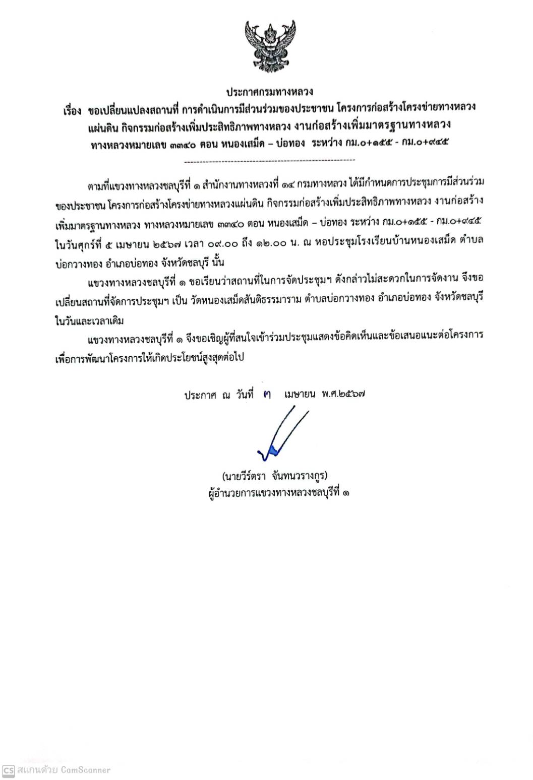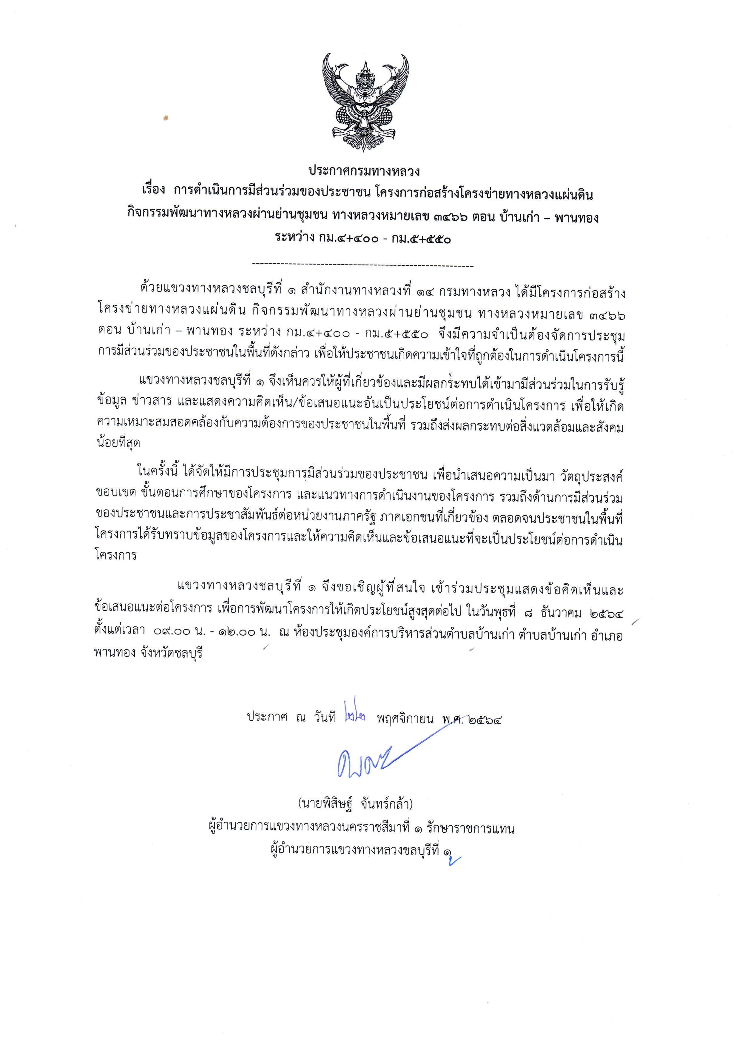 ประกาศกรมทางหลวง เรื่อง การดำเนินการมีส่วนร่วมของประชาชน โครงการก่อสร้างโครงข่ายทางหลวงแผ่นดิน กิจกรรมพัฒนาทางหลวงผ่านย่านชุมชน ทางหลวงหมายเลข 3466 ตอน บ้านเก่า - พานทอง ระหว่าง กม. 4+400 - กม. 5+550