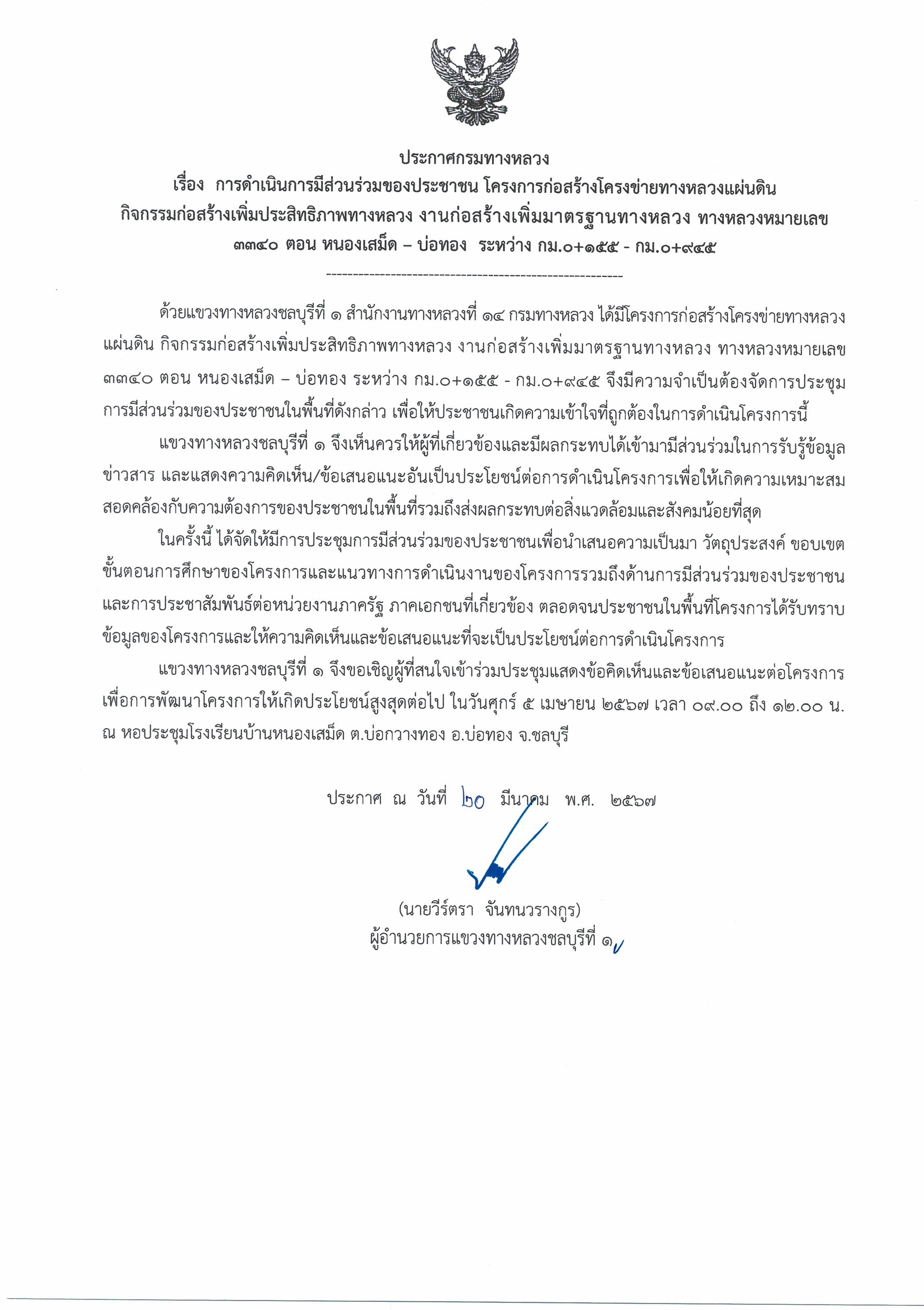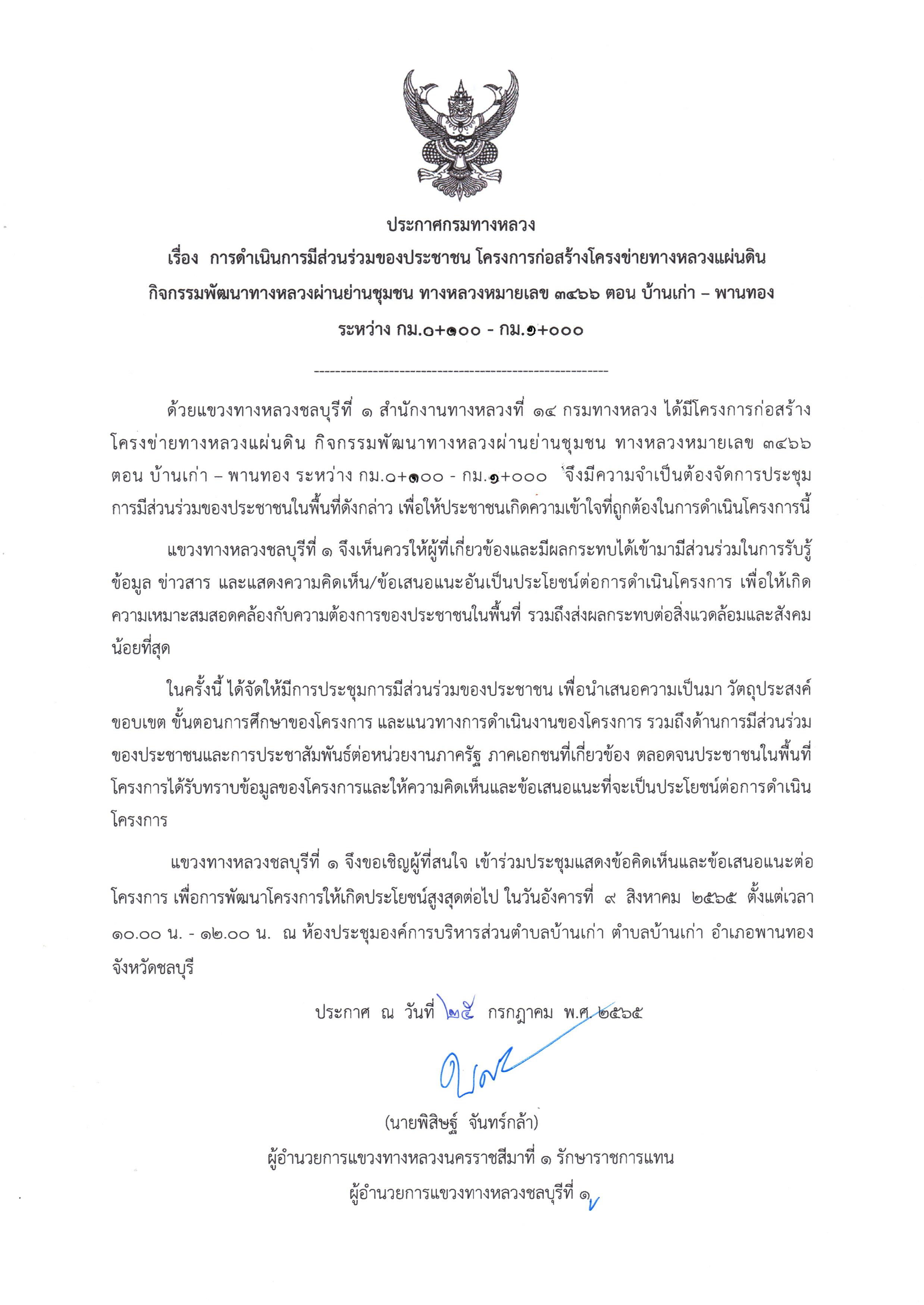 ประกาศกรมทางหลวง เรื่อง การดำเนินการมีส่วนร่วมของประชาชน โครงการก่อสร้างโครงข่ายทางหลวงแผ่นดิน กิจกรรมพัฒนาทางหลวงผ่านย่านชุมชน ทางหลวงหมายเลข 3466 ตอน บ้านเก่า - พานทอง ระหว่าง กม. 0+100 - กม.1+000 (วันที่ 9 สิงหาคม 2565 เวลา 10.00 น. - 12.00 น.)