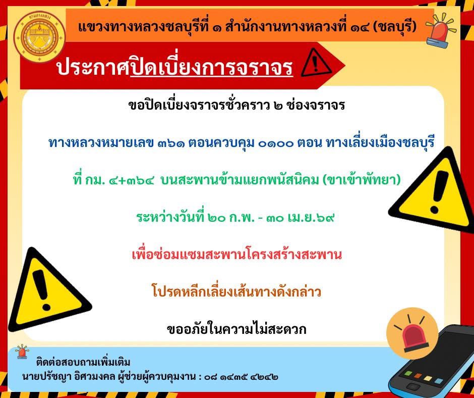 ปิดการจราจร ๑ ช่องจราจรขวา บริเวณโค้งเข้าทางเลี่ยงเมืองชลบุรี ทางหลวงหมายเลข ๓๖๑ ระหว่าง กม.๐+๐๐๐ - กม.๐+๔๐๐ เพื่อก่อสร้างสะพานข้ามแยก ระหว่างวันที่ ๒๔ กุมภาพันธ์ - ๓๑ พฤษภาคม ๒๕๖๙