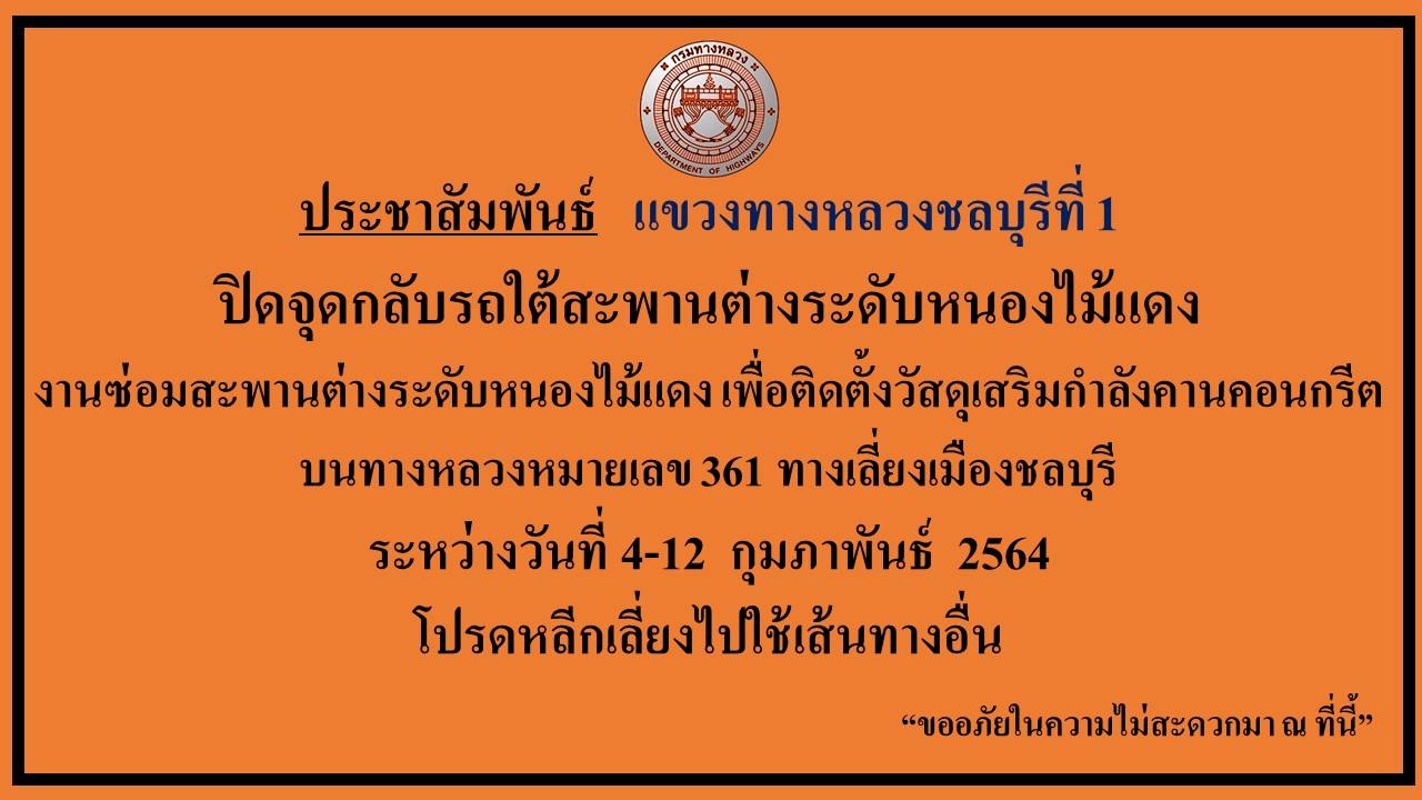 ??ประชาสัมพันธ์?? แขวงทางหลวงชลบุรีที่ 1 ปิดจุดกลับรถใต้สะพานต่างระดับหนองไม้แดง (ปิดชั่วคราว)