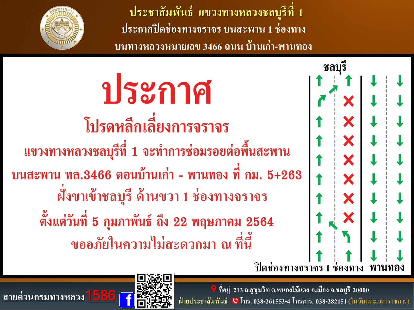 ??ประชาสัมพันธ์?? แขวงทางหลวงชลบุรีที่ 1 ประกาศปิดช่องทางจราจร บนสะพาน 1 ช่องทาง ถนน บ้านเก่า-พานทอง