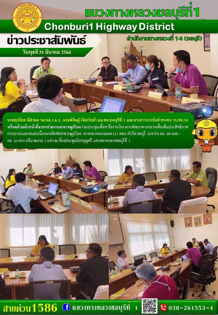วันพุธที่ 31 มีนาคม 2564 ประชุมเพื่อหารืองานโครงการพัฒนาทางหลวงเพื่อเพิ่มประสิทธิภาพการจราจรและขนส่งเนื่องจากติดขัดสาธารณูปโภค