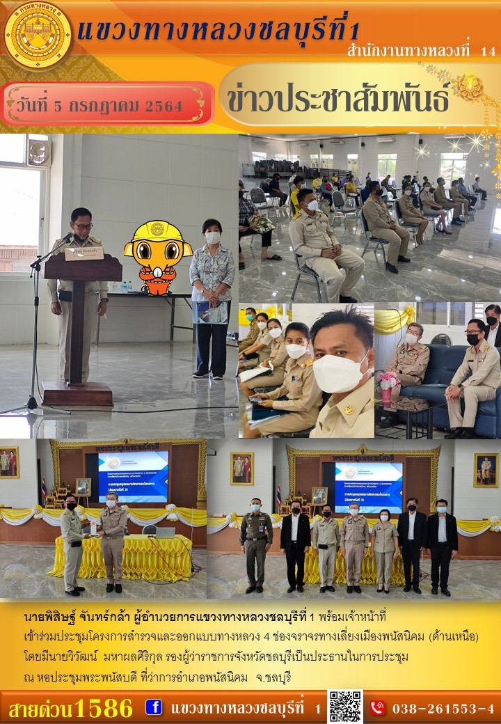 วันที่ 5 กรกฏาคม 2564 นายพิสิษฐ์ จันทร์กล้า ผู้อำนวยการแขวงทางหลวงชลบุรีที่ 1 พร้อมเจ้าหน้าที่ เข้าร่วมประชุมโครงการสำรวจและออกแบบทางหลวง 4 ช่องจราจร ทางเลี่ยงเมืองพนัสนิคม (ด้านเหนือ)