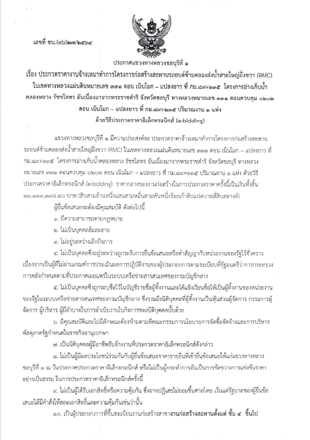 ประกาศประกวดราคาจ้างเหมาทำการก่อสร้างโครงการก่อสร้างสะพานรถยนต์ข้ามคลองส่งน้ำสายใหญ่ฝั่งขวา ( RMC ) ในเขตทางหลวงแผ่นดินหมายเลข 331 ตอน เนินโมก - แปลงยาว ที่ กม.89+235 โครงการอ่างเก็บน้ำคลองหลวง รัชชโลทร อันเนื่องมาจากพระราชดำริ จังหวัดชลบุรี ปริมาณงาน 1 แห่ง
