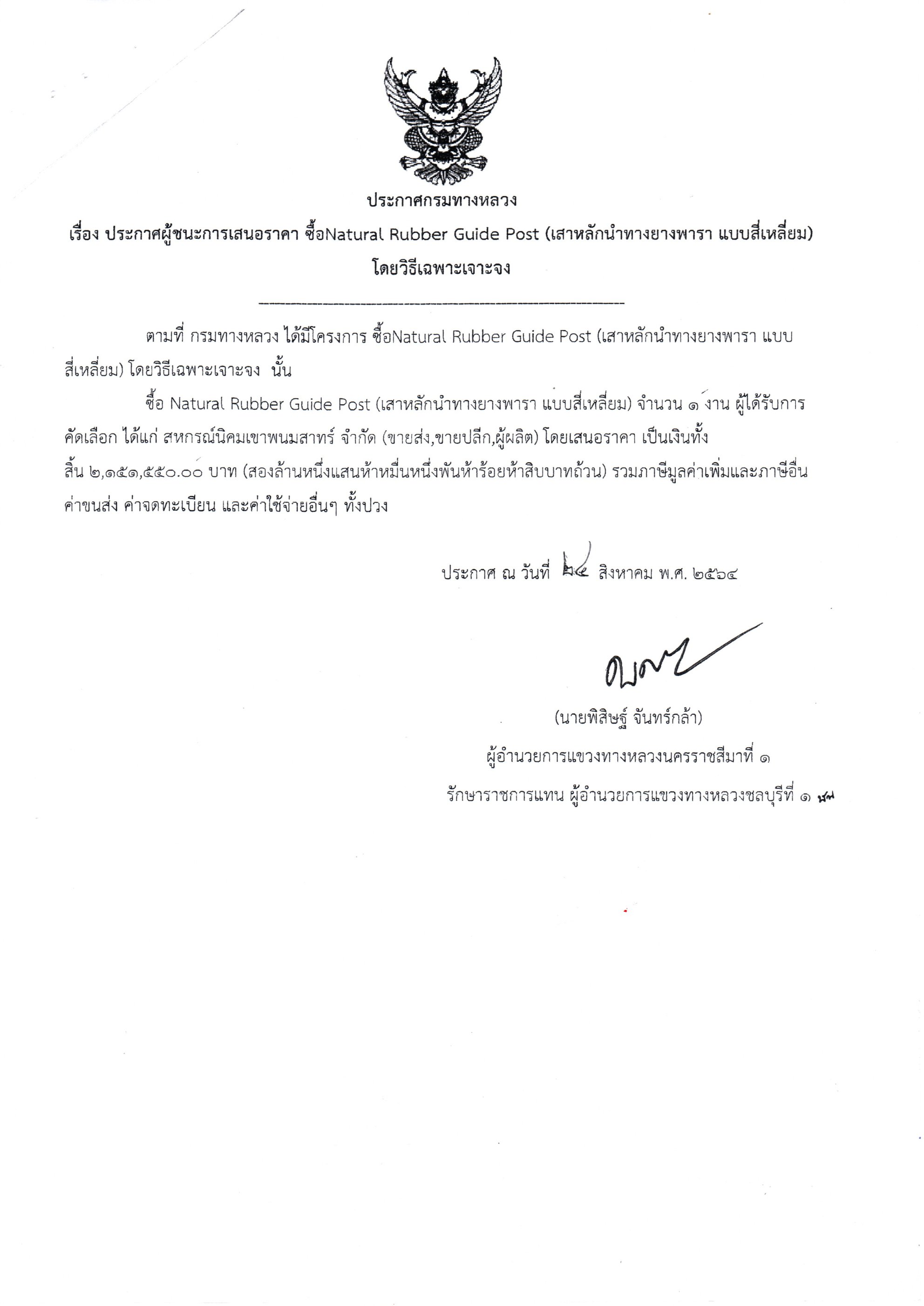 ประกาศผู้ชนะการเสนอราคา ซื้อNatural Rubber Guide Post (เสาหลักนำทางยางพารา แบบสี่เหลี่ยม)