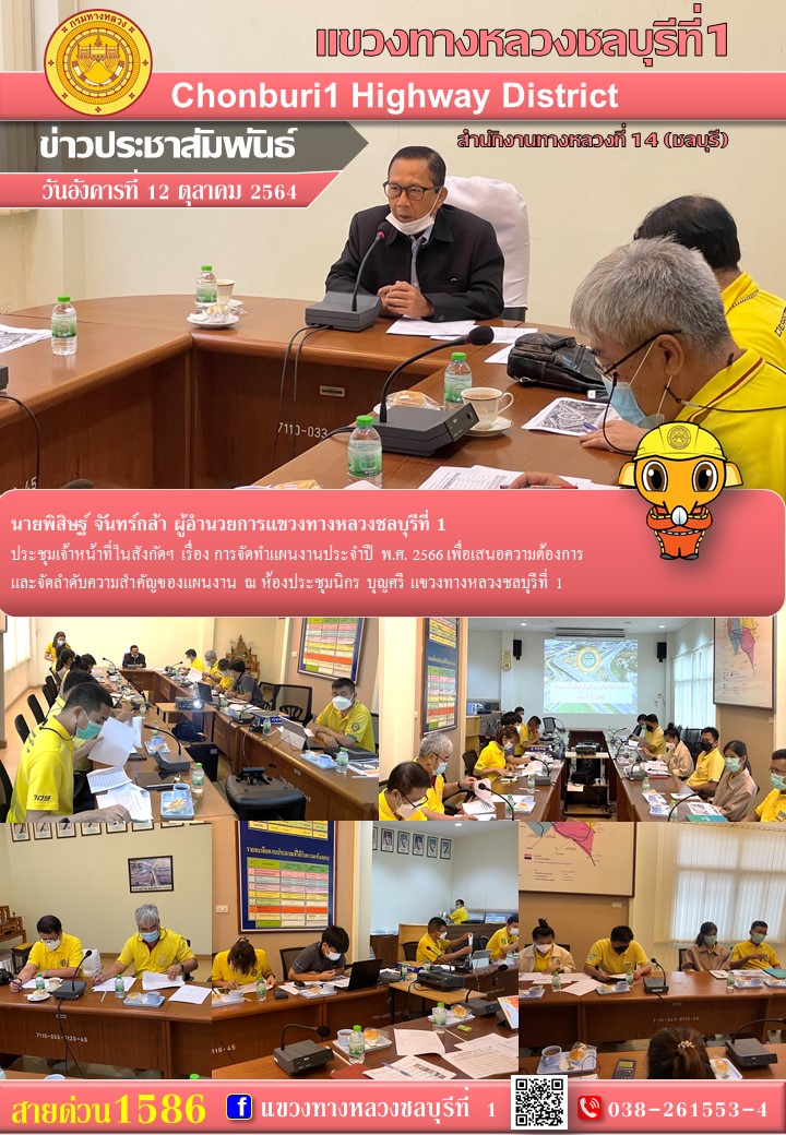 วันอังคารที่ 12 ตุลาคม 2564 นายพิสิษฐ์ จันทร์กล้า ผู้อำนวยการแขวงทางหลวงชลบุรีที่ 1 ประชุมเจ้าหน้าที่ในสังกัดฯ เรื่อง การจัดทำแผนงานประจำปี พ.ศ. 2566