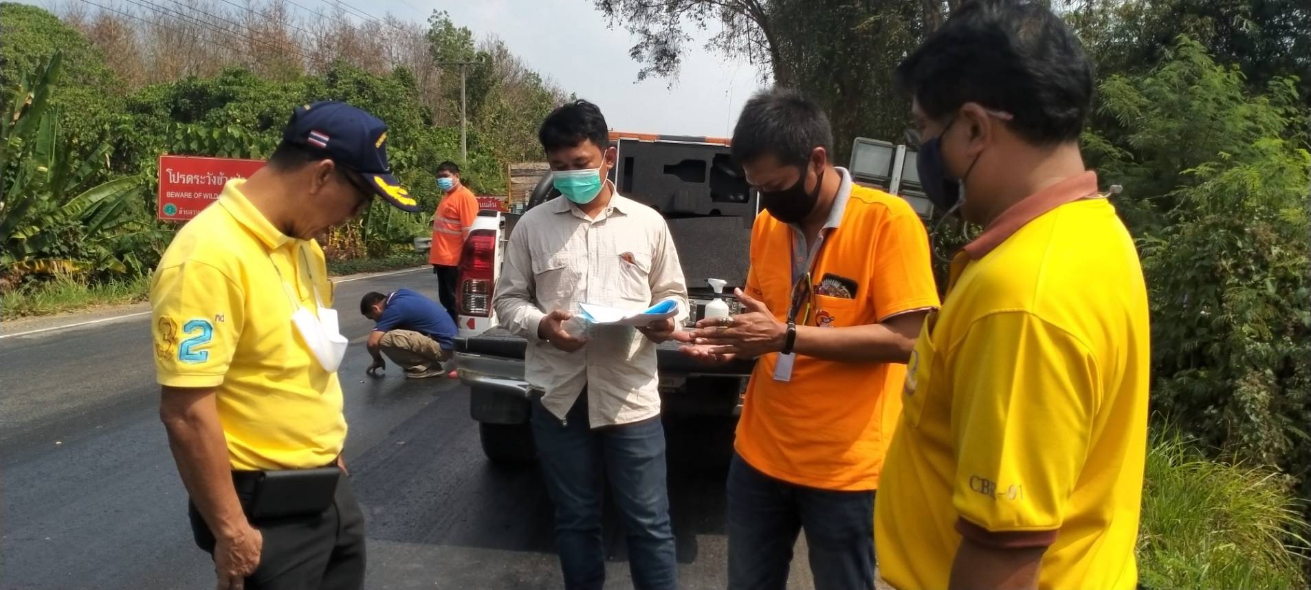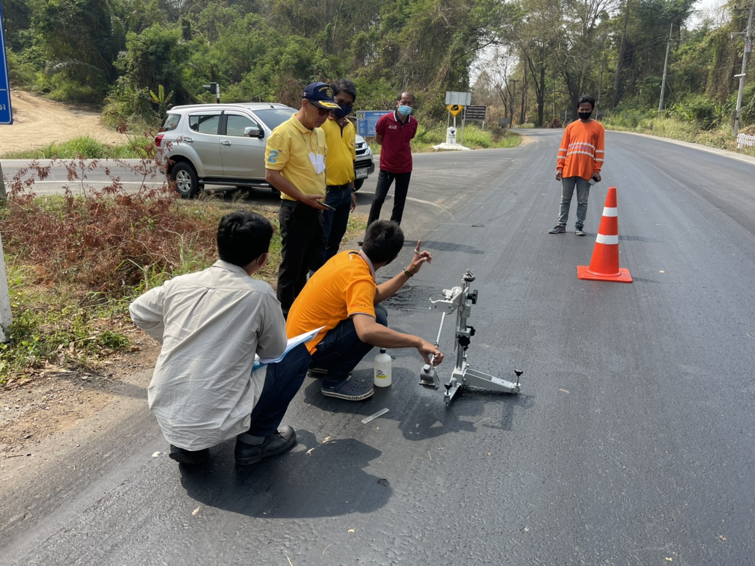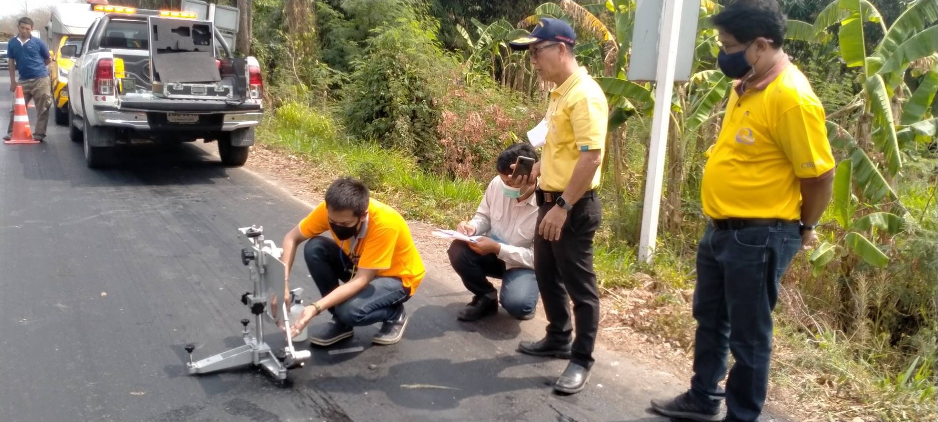 ร่วมกันทดสอบวัดผลค่าความลื่นของผิวถนน บนทางหลวงหมายเลข 3245 ตอน หนองเสือช้าง - หนองเสือช่อ ระหว่าง กม. 46+000 - กม. 47+000