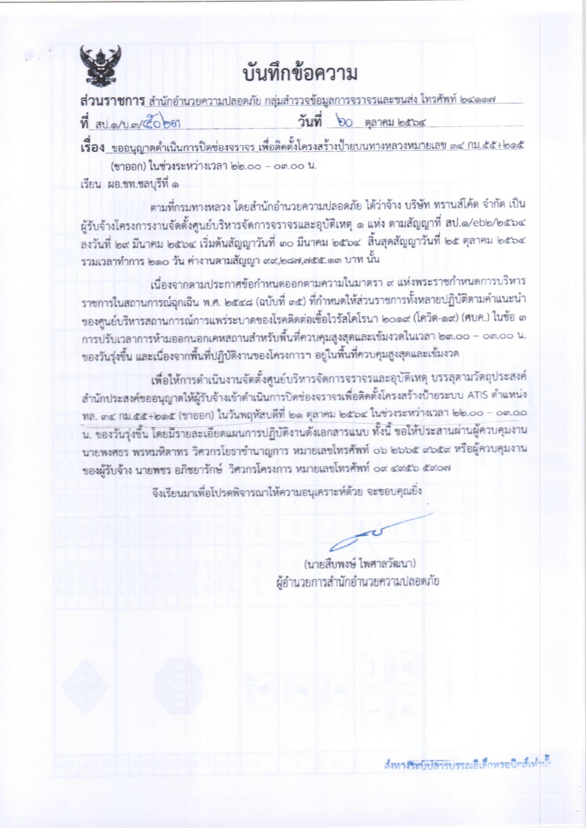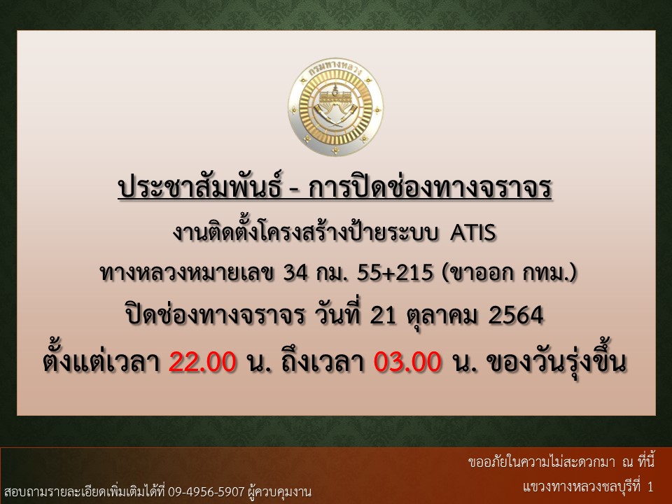 วันที่ 21 ตุลาคม 2564 ประกาศปิดช่องทางจราจรชั่วคราว บนทางหลวงหมายเลข 34 ที่ กม.55+215