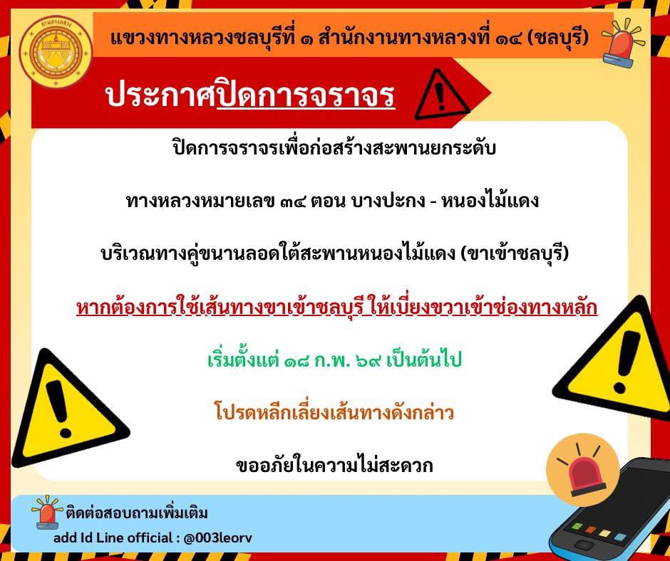 ปิดการจราจรเพื่อก่อสร้างสะพานยกระดับ ทางหลวงหมายเลข ๓๔ ตอน บางปะกง - หนองไม้เเดง บริเวณทางคู่ขนานลอดใต้สะพานหนองไม้เเดง ตั้งเเต่วันที่ ๑๘ กุมภาพันธ์ ๖๙ เป็นต้นไป