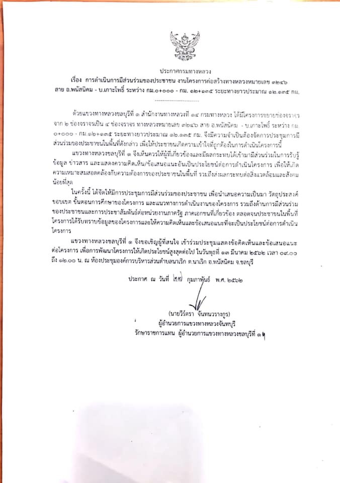 ??ประกาศกรมทางหลวง????เรื่อง:การดำเนินการมีส่วนร่วมของประชาชน งานโครงการก่อสร้างทางหลวงหมายเลข 3246 สาย อ.พนัสนิคม - บ.เกาะโพธิ์ ระหว่าง กม.0+000 - กม.12+135 ระยะทางยาวประมาณ 12.135 กม.