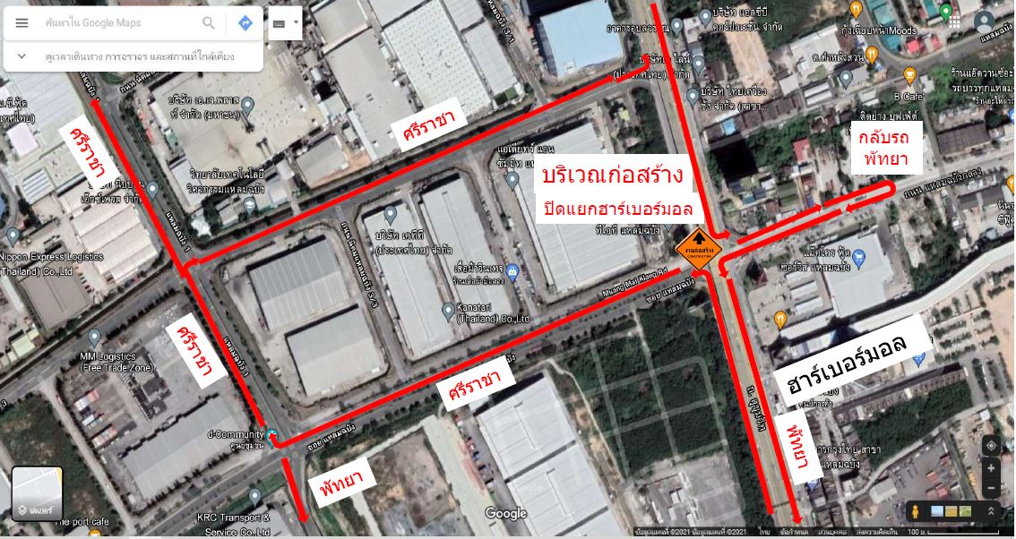 แผนผังและรูปถ่ายการจัดการจราจรบริเวณพื้นที่ก่อสร้างทางหลวงหมายเลข 36 - ต่างระดับมาบเอียง จ.ชลบุรี ระหว่างวันที่ 21 กุมภาพันธ์ - 27 กุมภาพันธ์ 2565