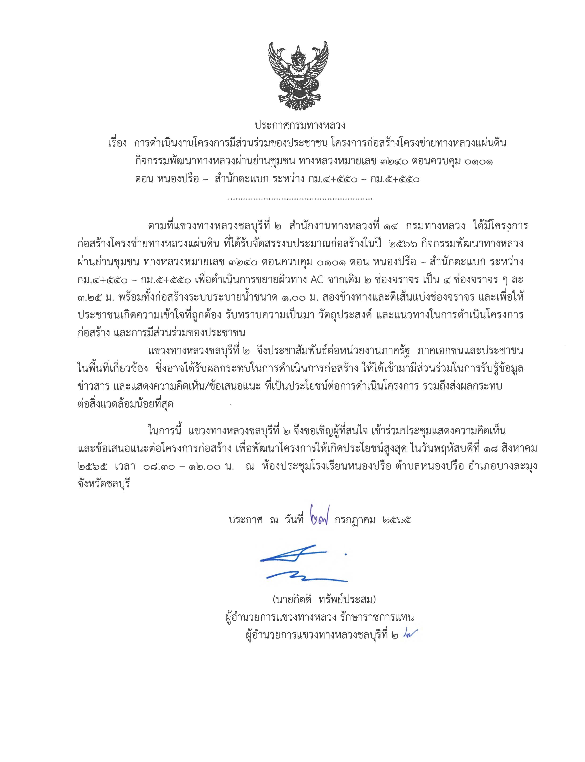 "ขอเชิญชวน รับฟังการดำเนินงานโครงการมีส่วนร่วมของประชาชน โครงการก่อสร้างโครงข่ายทางหลวงแผ่นดินกิจกรรมก่อสร้างเพิ่มประสิทธิภาพทางหลวง ทางหลวงหมายเลข 3240 ตอนควบคุม 0101 ตอน หนองปรือ - สำนั้กตะแบก ระหว่าง กม.8+760 - กม.10+240 ในวันพฤหัสบดีที่ 18 สิงหาคม 2565 เวลา 13.00 - 16.30 น. ณ ห้องประชุมเทศบาลโป่ง ตำบลโป่ง อำเภอบางละมุง จังหวัดชลบุรี