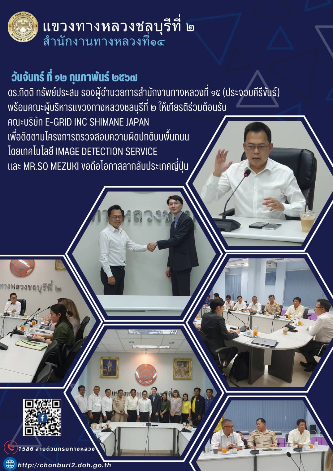 "ขอเชิญชวน รับฟังการดำเนินงานโครงการมีส่วนร่วมของประชาชน โครงการก่อสร้างโครงข่ายทางหลวงแผ่นดินกิจกรรมพัฒนาทางหลวงผ่านย่านชุมชน ทางหลวงหมายเลข 3240 ตอนควบคุม 0101 ตอน หนองปรือ - สำนักตะแบก ระหว่าง กม.4+550 - กม.5+550 ในวันพฤหัสบดีที่ 18 สิงหาคม 2565 เวลา 08.30 - 12.00 น. ณ ห้องประชุมโรงเรียนหนองปรือ ตำบลหนองปรือ อำเภอบางละมุง จังหวัดชลบุรี