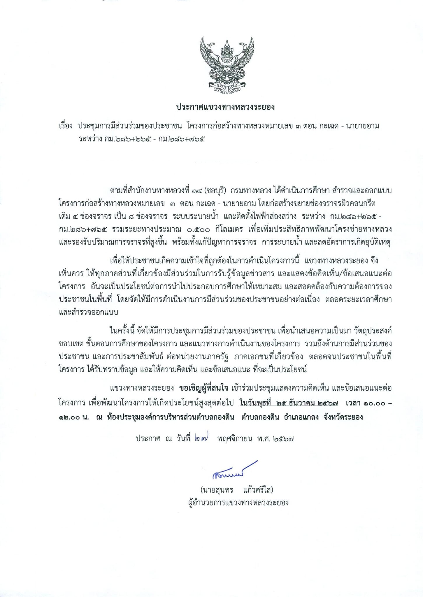 รายงานสรุปผลการดำเนินงานการมีส่วนร่วมของประชาชน โครงการก่อสร้างทางหลวงหมายเลข 3 ตอน กระเฉด-นายายอาม ระหว่าง กม.286+265-กม.286+765 ระยะทางประมาณ 0.500 กิโลเมตร