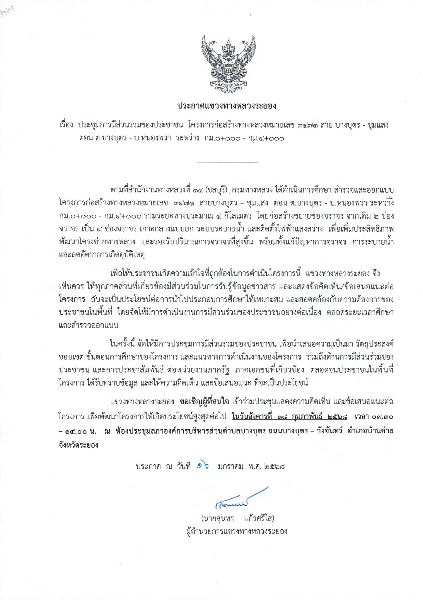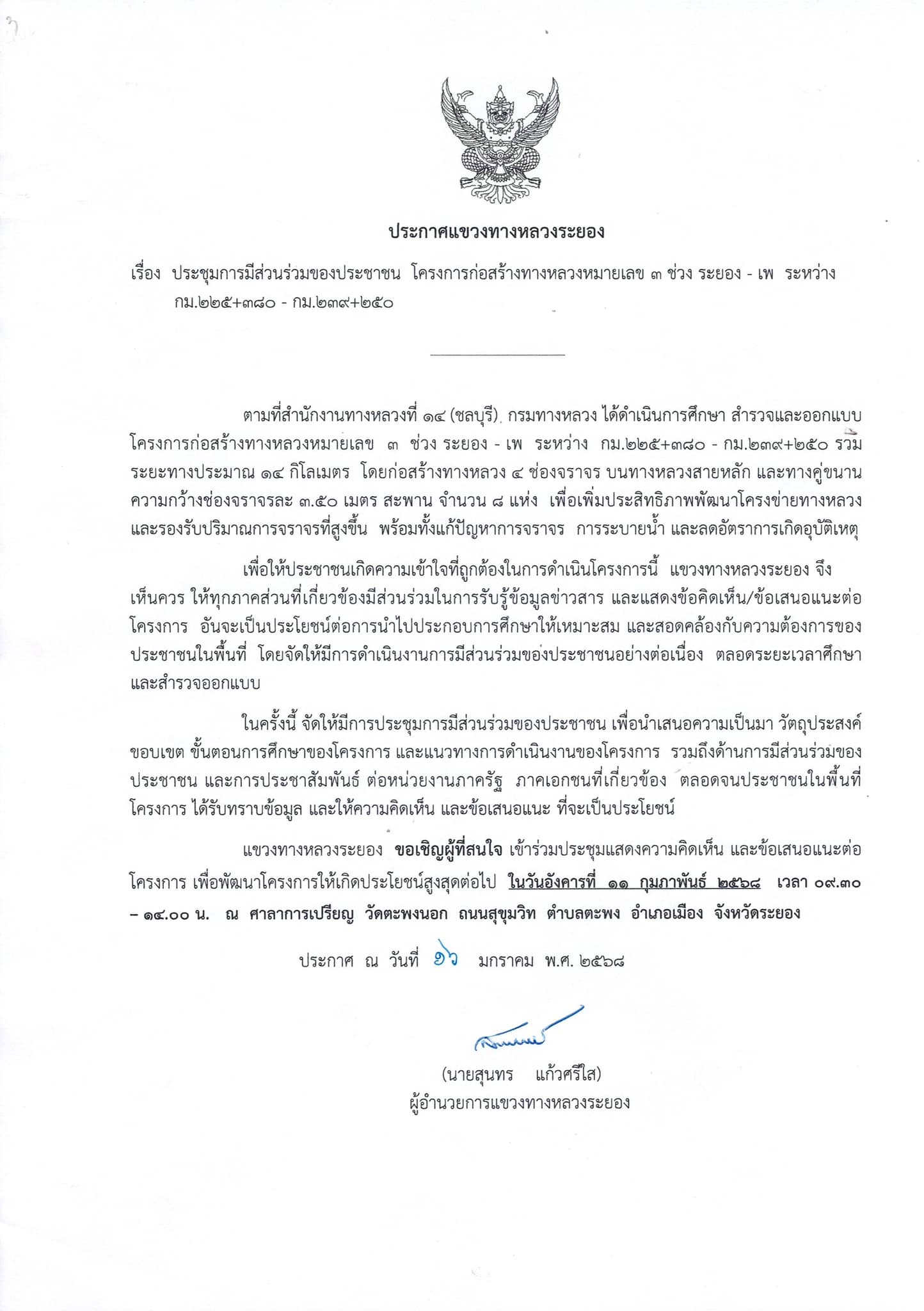 การประชุมการมีส่วนร่วมของประชาชน โครงการก่อสร้างทางหลวงหมายเลข 3 ระยอง-เพ ระหว่าง กม.225+380 - กม.239+250