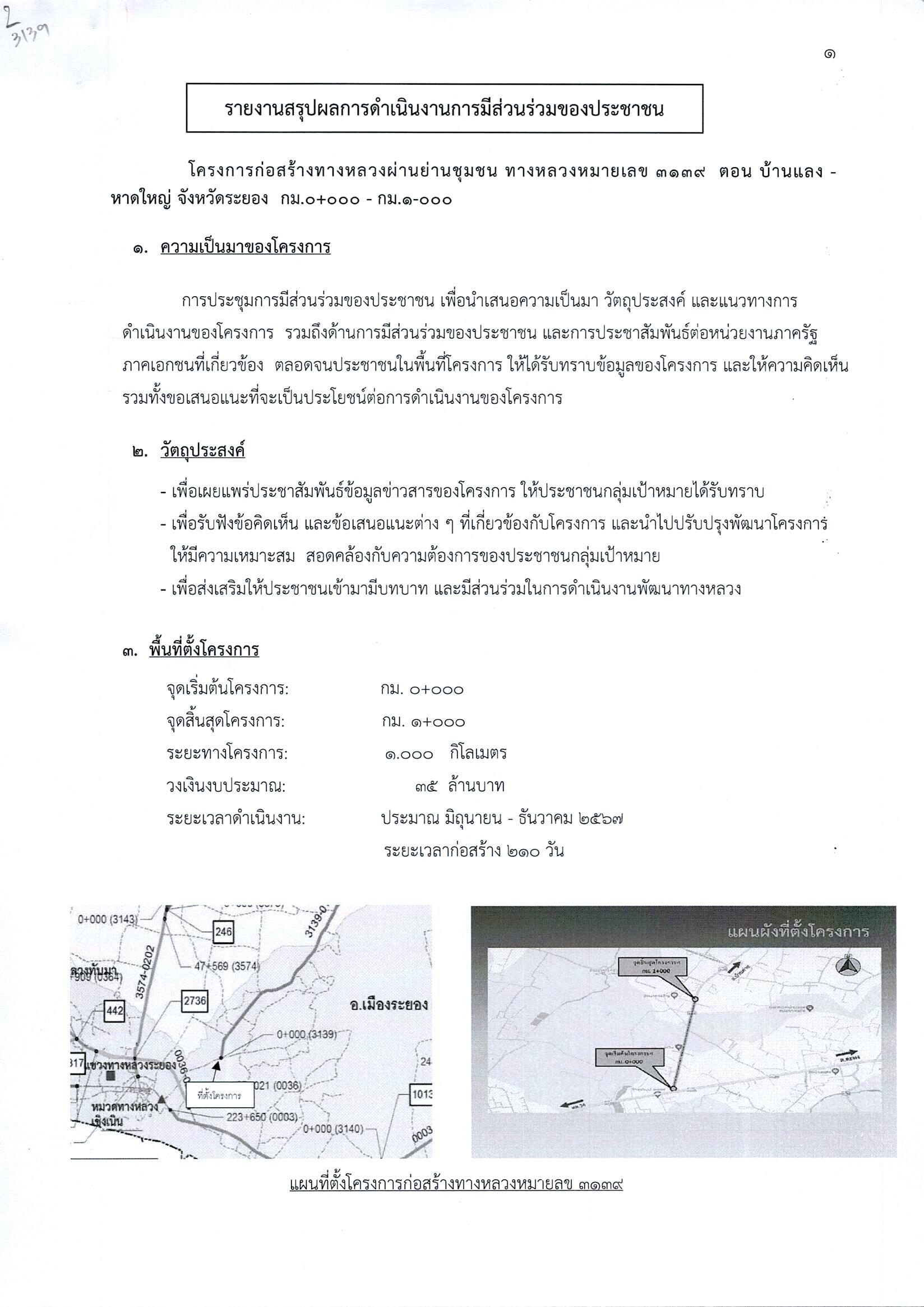 37 18/04/2567 รายงานสรุปผลการดำเนินงานการมีส่วนร่วมของประชาชน โครงการพัฒนาทางหลวงผ่านย่านชุมชน ทางหลวงหมายเลข 3139 ตอน บ้านแลง - หาดใหญ่ จังหวัดระยอง กม.0+000 - กม.1+000