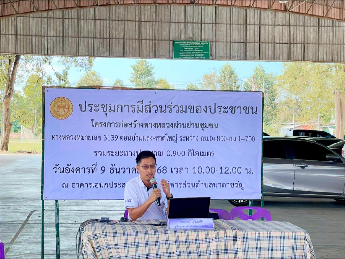 จัดประชุมการมีส่วนร่วมของประชาชน เพื่อรับฟังความคิดเห็นโครงการก่อสร้างทางหลวงหมายเลข 3139 ตอน บ้านแลง - หาดใหญ่ ระหว่าง กม.0+800 - กม.1+700 ระยะทางประมาณ 0.900 กิโลเมตร